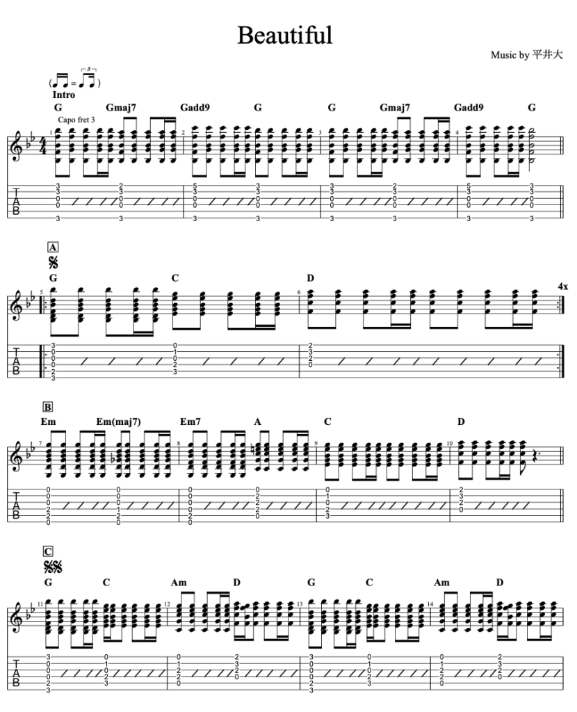 今回はBeautiful/平井大ギターのアコースティックギターでアレンジしたフレーズをTAB譜・コード・歌詞連動で練習ができます。弾き語り用としても役に立つと思います。是非、練習してみてください!