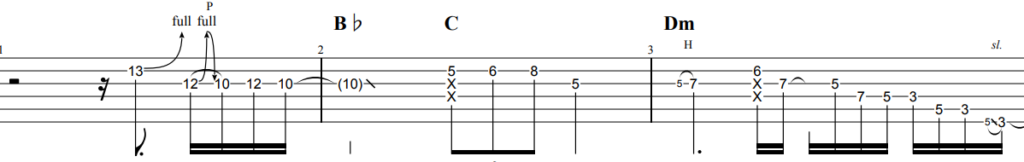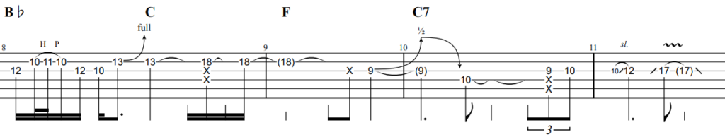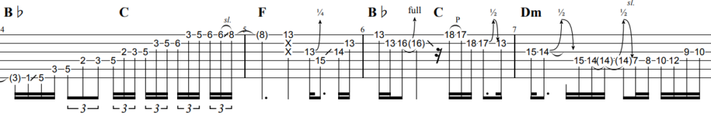 いろいろな種類のチョーキングがでてきますのでそこをしっかり使い分けましょう。一音、半音、クオーターと音程をしっかり意識しましょう。またフレーズのタイミングなど拍を意識して演奏することも大事です。3~4小節にかけて16分音符で下降した後に1拍3連、6連符と上昇するフレーズと変わるのでリズムをしっかり切り替えて演奏しましょう。5小節目ではブルーノートの音使いをしているところも注目です。