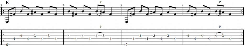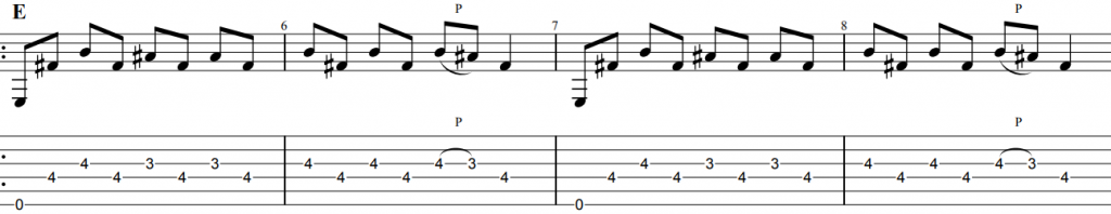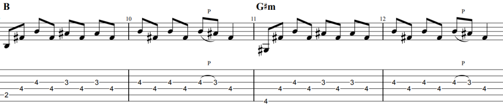 このアルペジオはベース音のみが変化していくパターンのフレーズです。なので中指・薬指・小指は固定してポジションで人差し指・親指を使用してベース音を変化させています。ピッキングは8分音符を基準にオルタネイトピッキングをするとリズムが取りやすいと思います。