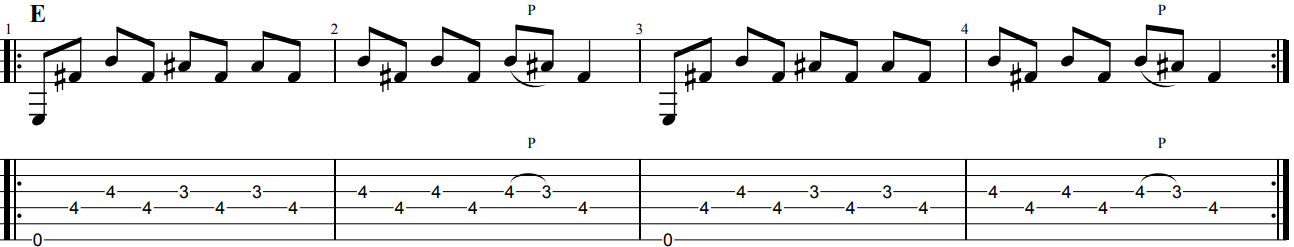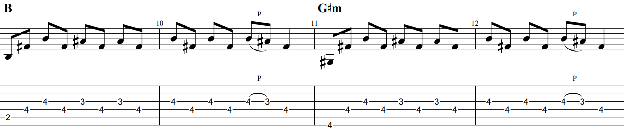 このアルペジオはベース音のみが変化していくパターンのフレーズです。なので中指・薬指・小指は固定してポジションで人差し指・親指を使用してベース音を変化させています。ピッキングは8分音符を基準にオルタネイトピッキングをするとリズムが取りやすいと思います。