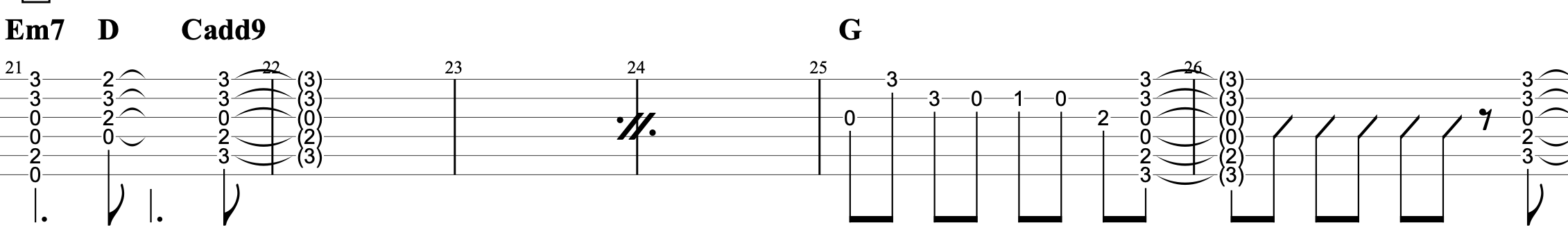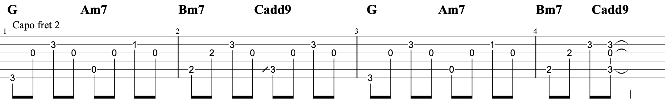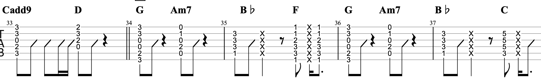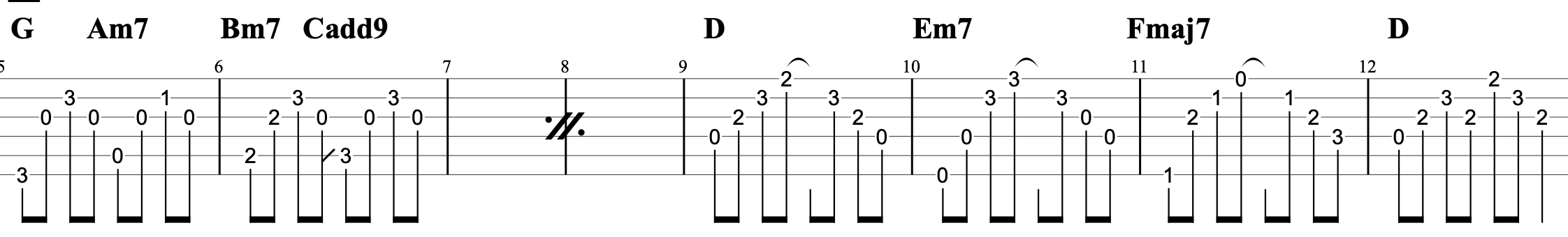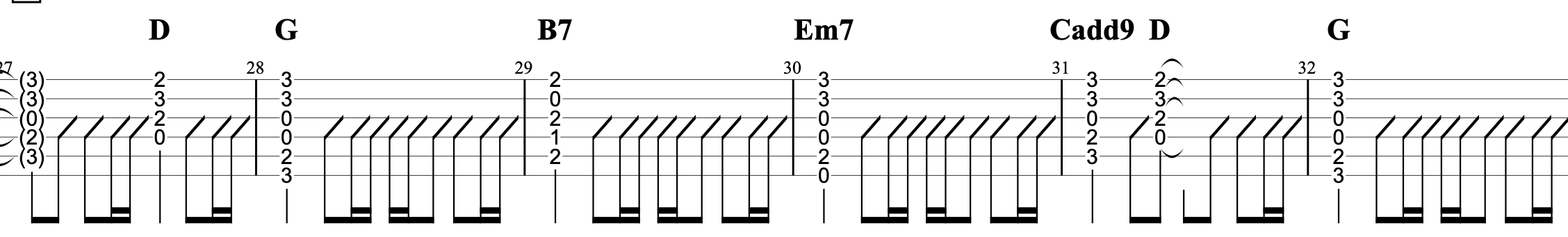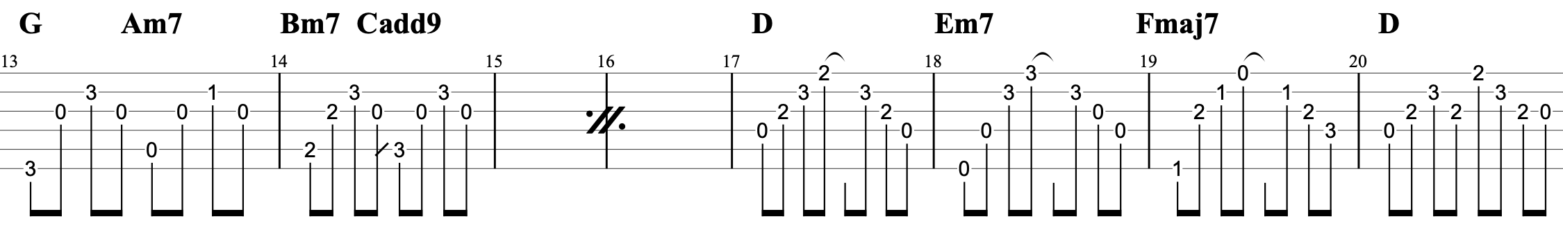 前半のアルペジオは音が途切れないように意識して演奏しましょう。開放弦が多用されているのでそこをうまく活用して左手のフィンガリングをしてあげるとスムーズに弾けると思います。ストロークは8分音符や16分音符のフレーズが出てきますのでそこは自分の中でストロークのダウンアップをどちらを基準にして弾くのかを切り替えて演奏してあげましょう。間奏ではGメジャーペンタトニックスケール+ブルーノートを入れたフレージングとなっています。スタッカートや休符を意識してリズミカルに演奏しましょう。