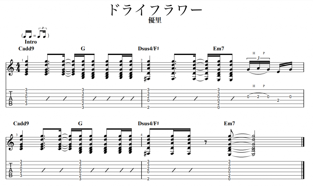 優里さんの「ドライフラワー」のイントロのギターフレーズの弾き方を詳しく解説しています!エレキギターでのストロークでハンマリング・プリングを使用したフレーズとなっています。
