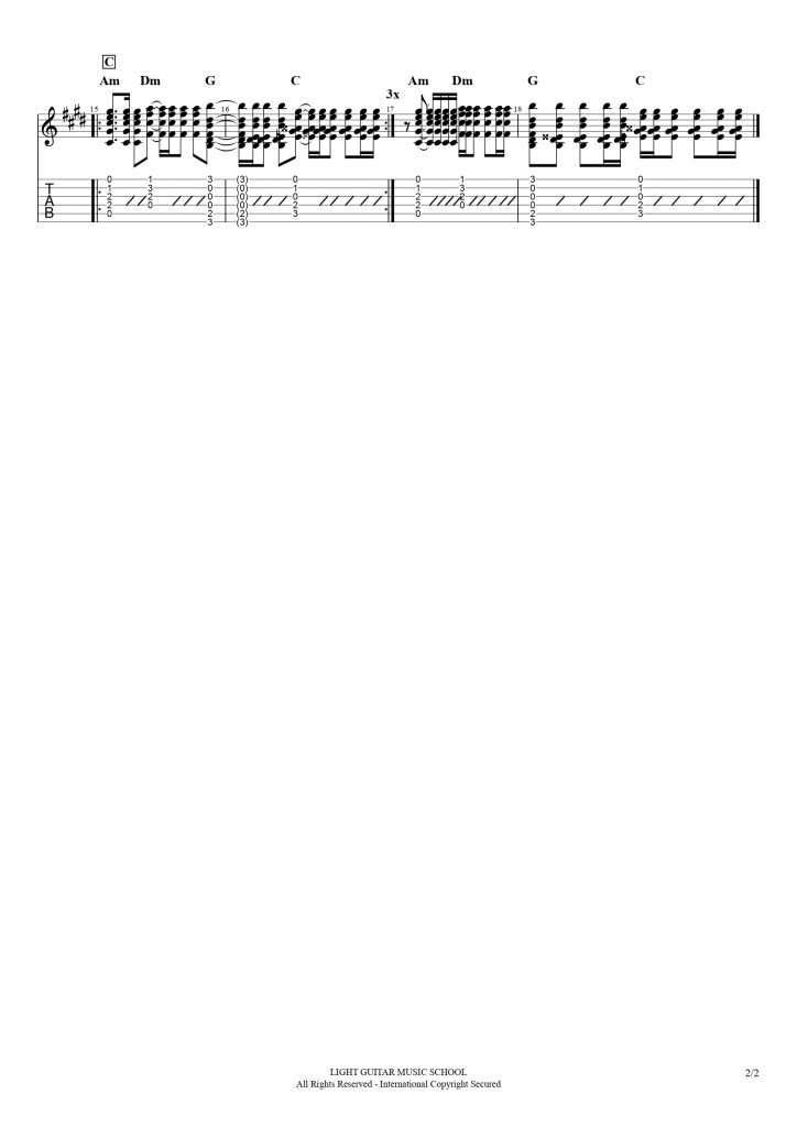 コードはAm・Dm・G・Cとシンプルなコード進行です。イントロは裏拍でコードチェンジしています。また、イントロはコードを伸ばして弾くだけですが16ビートのノリを意識して演奏しましょう。Aメロはブリッジミュートでタイトに演奏しましょう。ここも4分音符での演奏が主ですが常に16分音符を意識を忘れずに。Bメロは16ビートのストロークになります。Cメロは1小節に2つのコードで進行します。イントロと同じように裏拍でコードチェンジします。7小節目の1拍目表は8分休符になていますので音を切りましょう。そして、7・8小節目のコードチェンジのタイミングは拍表になりますのでそこは注意しましょう。