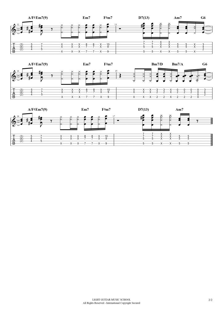 16ビートのカッティングフレーズ。フレーズはイントロ1とイントロ2の二つのパターンに大きく分けられます。イントロ1は Ⅱ – Ⅴ – Ⅰ(ツーファイブワン)のコード進行を繰り返した構成になっています。コードもジャズでよく使用される9th・13th・♭13等のテンション音を使ったボイシングになっています。イントロ2ではギターとベースが巧みに重なり合ってコードを構成しているフレーズとなっています。休符も意識して演奏しましょう!