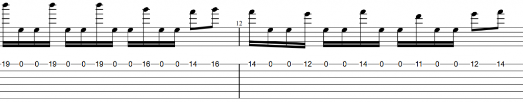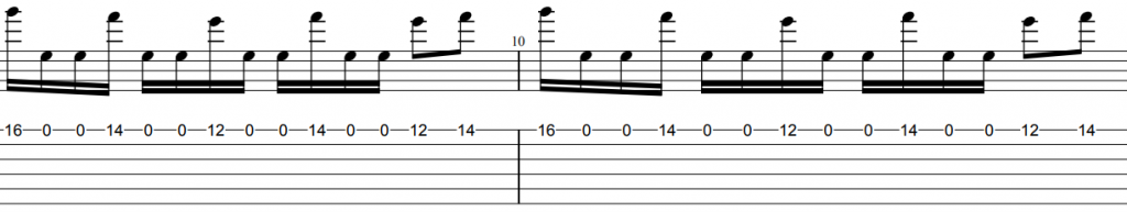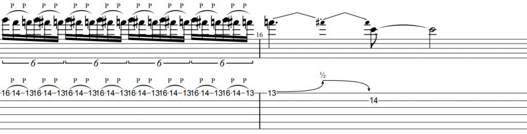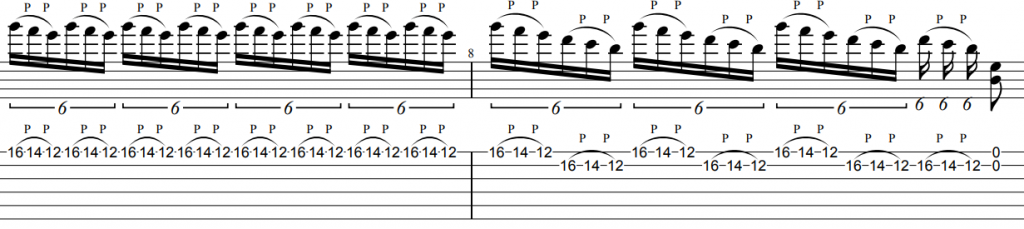 になります。まず開放弦のみで16分音符のオルタネイトピッキングを行ってみるとよいと思います。BMP150のテンポとなっていますのでメトロノームなどをならしてやってみましょう。これでこのテンポ感のピッキングをつかんで実際のフレーズを弾いてみると良いと思います。このときに右手と左手のタイミングがしっかりあうように意識しましょう。6連符のプリングは同じフレーズパターンを繰り返しているので単純なフレーズですがスピードがそこそこの早さになりますのでテンポにおいて行かれないように注意しましょう。最後にも同じプリングフレーズが来ますが1音のみ音を変化させているのですがこれはバックのコードが代やトニックコードのC#m7からC#7に変わっていることでこのような音の変化をしていると言うのも把握しておくと良いでしょう。