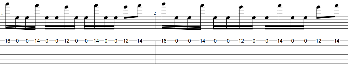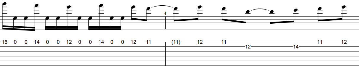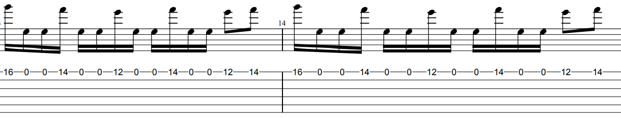 になります。まず開放弦のみで16分音符のオルタネイトピッキングを行ってみるとよいと思います。BMP150のテンポとなっていますのでメトロノームなどをならしてやってみましょう。これでこのテンポ感のピッキングをつかんで実際のフレーズを弾いてみると良いと思います。このときに右手と左手のタイミングがしっかりあうように意識しましょう。6連符のプリングは同じフレーズパターンを繰り返しているので単純なフレーズですがスピードがそこそこの早さになりますのでテンポにおいて行かれないように注意しましょう。最後にも同じプリングフレーズが来ますが1音のみ音を変化させているのですがこれはバックのコードが代やトニックコードのC#m7からC#7に変わっていることでこのような音の変化をしていると言うのも把握しておくと良いでしょう。