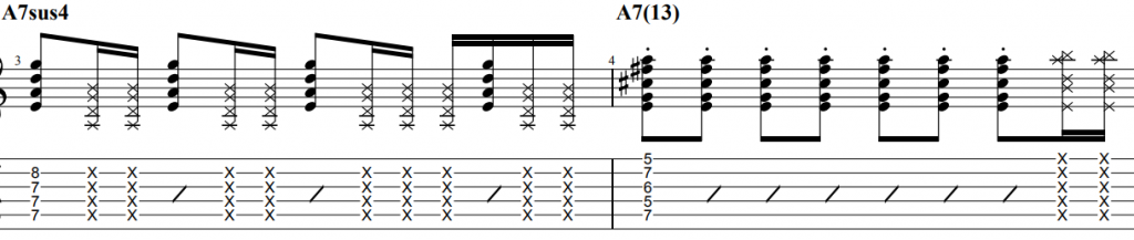 まずは16ビートののノリをしっかり意識しましょう。ノリをつかむために一度ブラッシングのみでメトロノームに合わせて16分音符のブラッシングをやってみると良いです。そこにこの曲のフレーズをあてはめる感じです。実音のところはスタッカートを意識して弾くとキレのあるサウンドになります。コードヴォイシングはテンション音などを含んだコードフォームだったりしますのでそこも理解して演奏できるとよいでしょう。