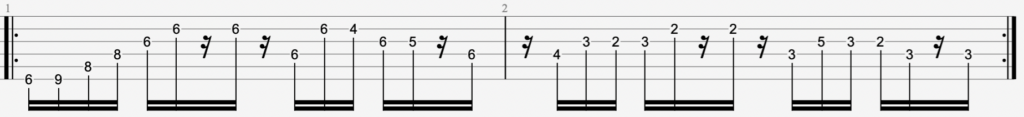 譜面には記載していませんが全体的にブリッジミュートをかけましょう。ただし、完全に全てにかけているというより2弦あたりのブリッジミュートのかかり具合は弱目の方が原曲のニュアンスに近くなると思います。曲のテンポに対してこの弦移動を多く含む16分音符のフレーズがピッキングがキツくなりますがスピーディーに弾くためにもピックが弦に入る深さは浅めで力加減のコントロールをしながら軽やかに弾くように心がけましょう。