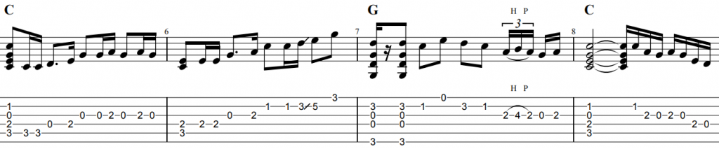 ピックを使用した演奏アレンジとしています。8分音符をダウンピッキングで16分音符をオルタネイトピッキングで考えて演奏すると良いでしょう。3連符や付点音符も出てきますのでリズムも意識をしましょう。