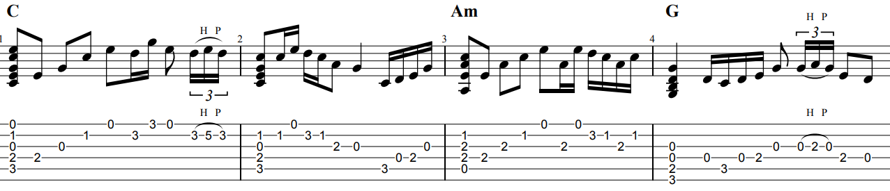 ピックを使用した演奏アレンジとしています。8分音符をダウンピッキングで16分音符をオルタネイトピッキングで考えて演奏すると良いでしょう。3連符や付点音符も出てきますのでリズムも意識をしましょう。