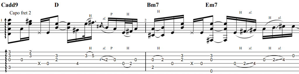 16分音符の細かいフレージングはハンマリング・プリング・スライドを使ってスピーディに演奏しましょう。また譜割りを理解してリズムにしっかりのせて演奏するように意識しましょう。