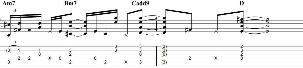 16分音符の細かいフレージングはハンマリング・プリング・スライドを使ってスピーディに演奏しましょう。また譜割りを理解してリズムにしっかりのせて演奏するように意識しましょう。