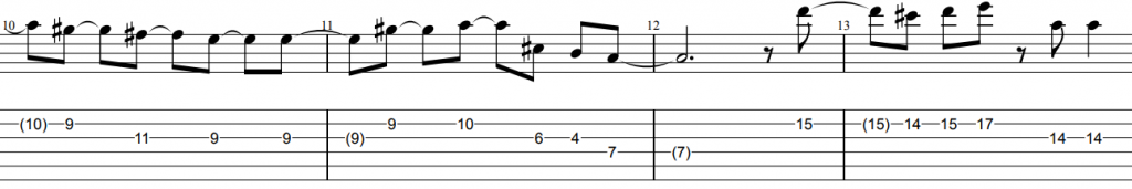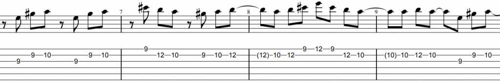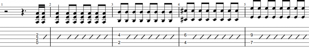 前半4小節はパワーコードから始まりオクターブ奏法へと変わります。この箇所は余計な弦がならないようにミュートを意識しましょう。また疾走感が出るようにストロークの右手はしっかり大きく振って演奏するとよいでしょう。(決して力まないように)その後は単音のメロディーフレーズとなります。ここは8分音符主体のオルタネイトピッキングで弾くとリズムが取りやすいと思います。フレーズ間に8分休符が多くはいっており拍の頭にあることからそこをダウンピッキングの空ピッキングにしてフレーズをアップからスタートすると良いでしょう。
