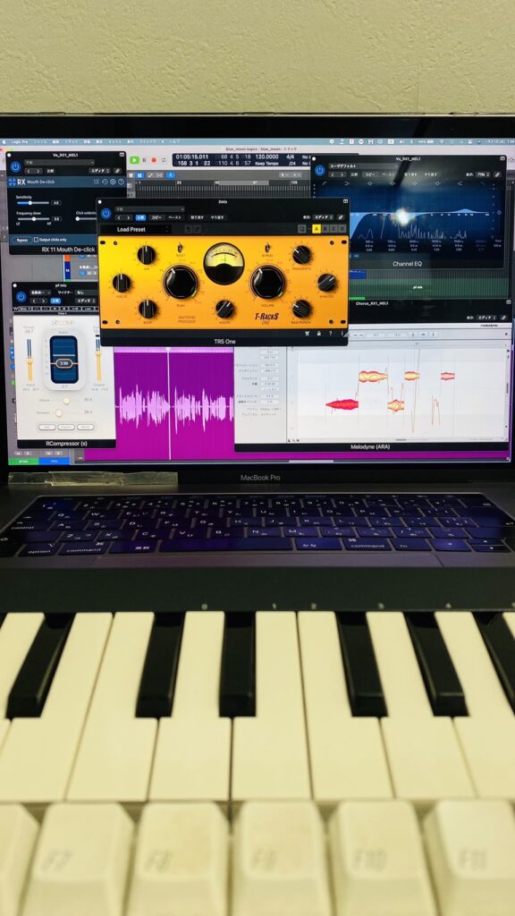 まずはノイズ除去作業から。プラグインはiZotope社のRXを使用。ボーカルのピッチ補正はMELODYNEを。その他WavesやIKmultimedia等のプラグインを使用しました。