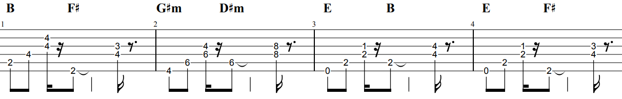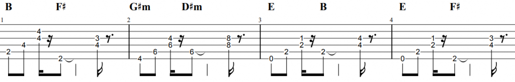 まず、指弾きで演奏しましょう。1小節単位で同じリズムパターンとなってます。休符を意識して演奏しましょう。