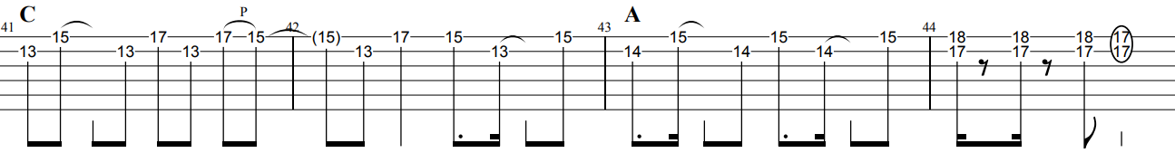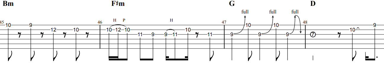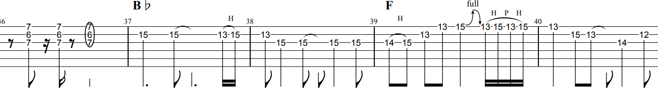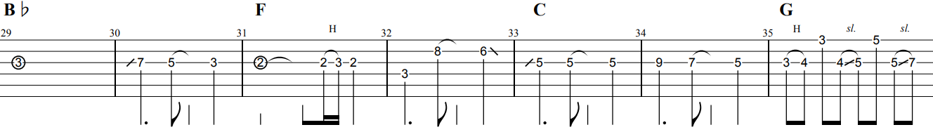 イントロ休符をしっかりとりながら演奏しましょう。またハンマリング・プリングもしっかりリリズミカルにリズミカルに演奏しましょう。