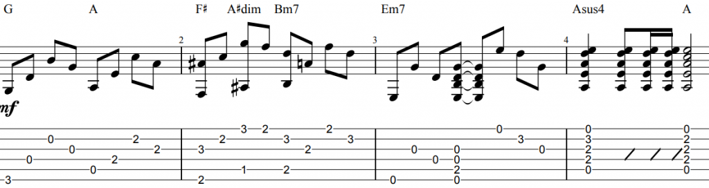 8分音符のアルペジオフレーズです。動画では弾き方は指弾きで解説をしていますがピックを持ってピックと指を併用してイントロを弾いても良いと思います。歌が始まるとストロークパターンになるのでそのフレーズにも入りやすいです。指弾きの場合はピックを持たずに指でそのままストロークしてもいいですし、イントロの指弾きの時にピックを右手の指で挟んでおき、ストロークになったらそのピックをスッと出してピック弾きのストロークに切り替えるというのもありです。そのあたりはやりやすい弾き方を選んでもらって大丈夫です。イントロでは基本のコードフォームを崩して押弦した方がフレーズ的にはスムーズに演奏しやすいと思います。