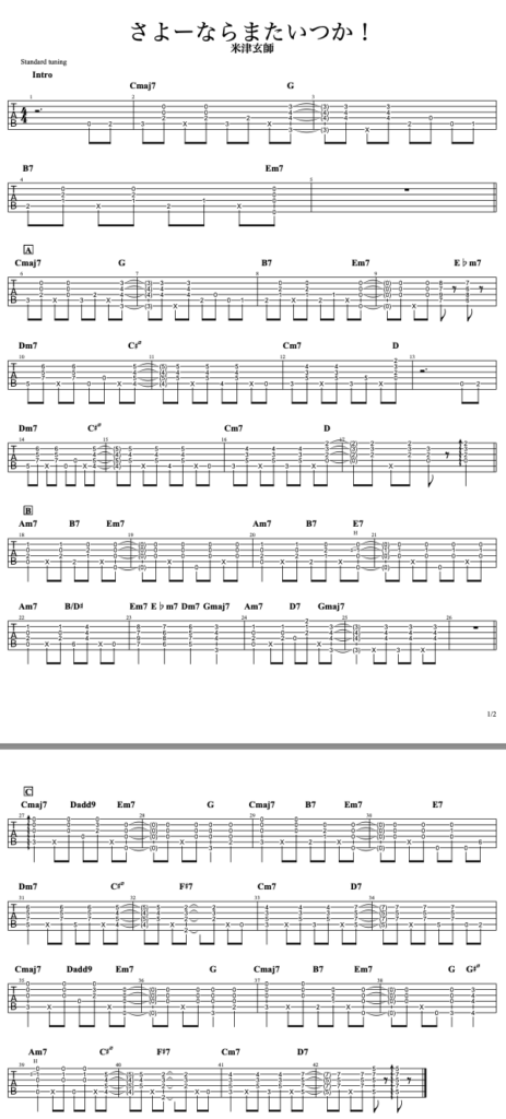 今回は米津玄師さんの「さよーならまたいつか!」を弾き語りもできるようにワンコーラス分ですがアコースティックでアレンジしたTAB譜・コード譜連動で練習ができます。NHK連続テレビ小説「虎に翼」の主題歌にもなっている曲ですね。是非、練習してみてください!