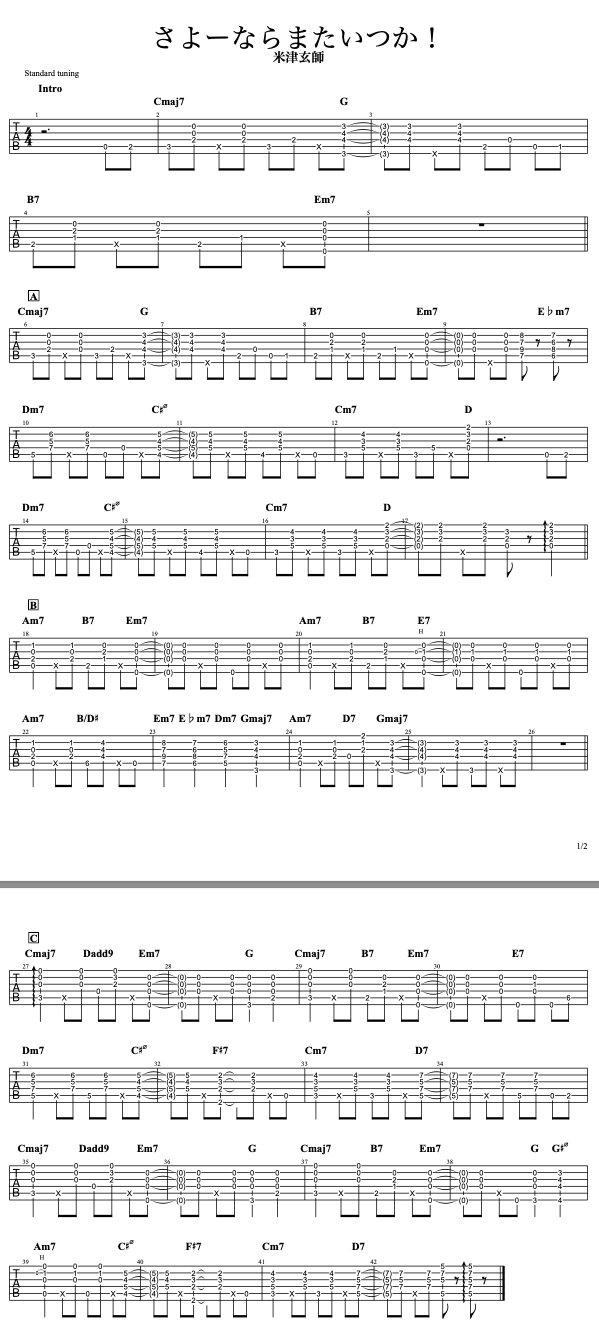 今回は米津玄師さんの「さよーならまたいつか!」を弾き語りもできるようにワンコーラス分ですがアコースティックでアレンジしたTAB譜・コード譜連動で練習ができます。NHK連続テレビ小説「虎に翼」の主題歌にもなっている曲ですね。是非、練習してみてください!