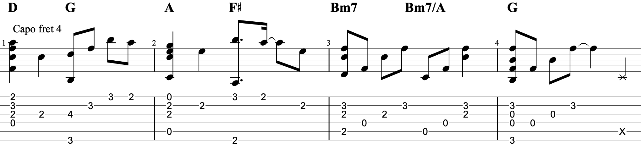 この曲はカポタストを4フレットにつけて演奏します。イントロでは指弾きで演奏されています。トップノートのメロディラインを意識して和音やアルペジオでの各弦の音量バランスを気をつけながらしましょう。メロディアスなフレージングになっているのでコードフォームは崩して親指を使ったりコードによって効率良く押弦を省略してスムーズな演奏を心がけましょう。