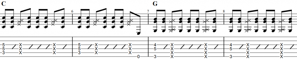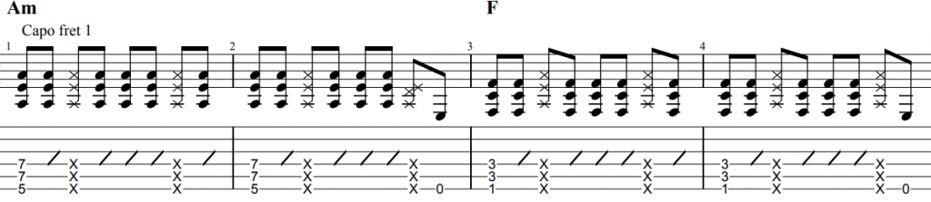 アコースティックバージョンは原曲keyより半音低く演奏されています。カポは1フレットにつけて演奏しましょう。コード進行はシンプルで基本的にパワーコード主体で演奏されています。その中でノリをしっかり意識しましょう。譜面通り弾くは簡単ですが本人の演奏の感じを出すためにはリズムにダイナミクスをつけて演奏をすることです。ひとつが2拍目、4拍目のアクセントをおいて演奏することです。全体的に右手のアタックは軽めの感覚で軽快に演奏すると近い感じになります。ギターをリズム楽器かのような意識で演奏するとよいかもしれません。一曲とおしてコード進行はループしており演奏も繰り返してはいるのですが右手でそのダイナミクスをコントロールしましょう。例えば曲間ではパワーコードのベース音しか鳴っていない時もあります。また、サビでは比較的、右手をしっかり振って盛り上がるよにも演奏しています。そのあたりは曲をよく聴いて参考にしましょう!