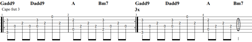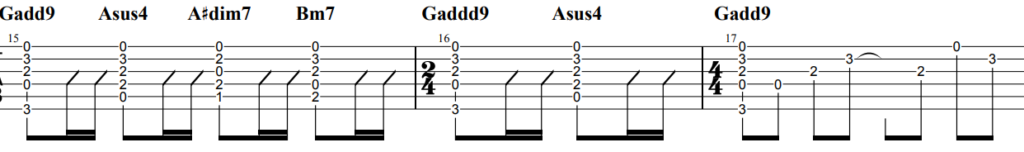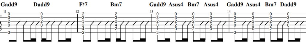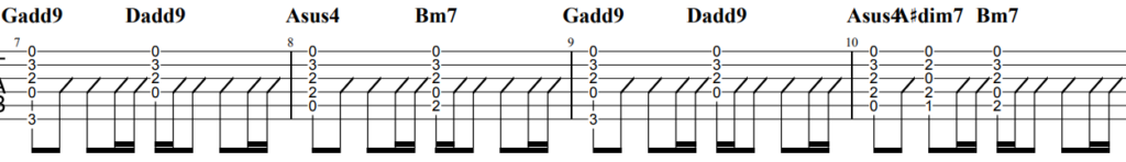全体的に16分音符のはねたリズムになっているのでそこを意識して演奏しましょう。指弾きのアルペジオからはじまります。2弦3弦のポジションを固定したフレーズになっている点に注目しましょう。サビは16分音符混じりのコードストロークです。しっかりはねたリズムを出してストロークしましょう。
