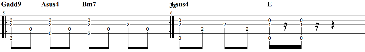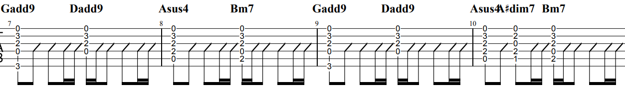 全体的に16分音符のはねたリズムになっているのでそこを意識して演奏しましょう。指弾きのアルペジオからはじまります。2弦3弦のポジションを固定したフレーズになっている点に注目しましょう。サビは16分音符混じりのコードストロークです。しっかりはねたリズムを出してストロークしましょう。