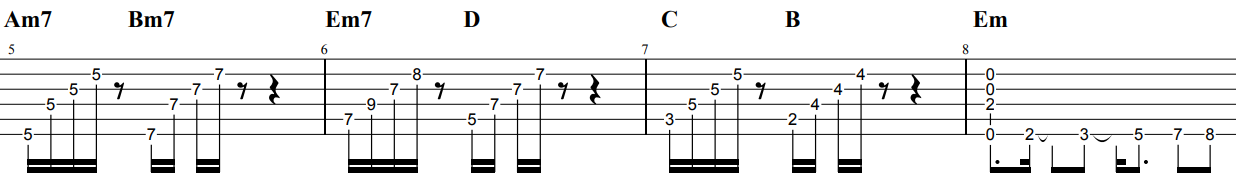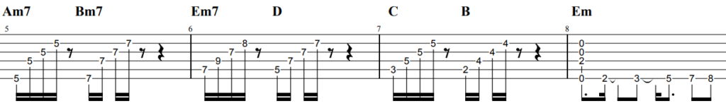 16分音符のリズムで指弾きで演奏します。このテンポ感に右手追いつかせるポイントは一つのコードに対して最初に弾く全ての弦に指を添えておき、そこから一本ずつ弾いていく弾き方をするとスピーディーに弾くことができます。1小節目のハーモニクスでは少しサドルよりでピッキングすると発音されやすくなります。