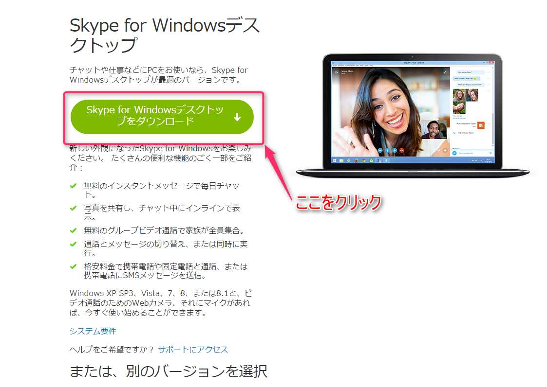 ①SkypeのWebサイトから最新バージョンをダウンロードします。