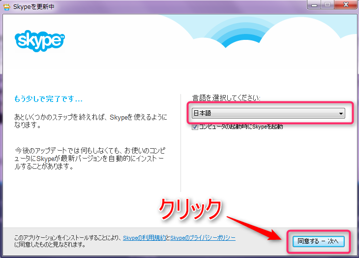 ②ダウンロードしたファイルに「skype setu full」 というアイコンがあるのでそれをクリックします。日本語を選択し、利用規約とプライバシーポリシーを確認し、「同意する」をクリック。