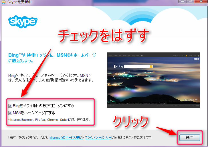 ③基本的に「Bingをデフォルトの検索エンジンにする」「MSNをホームページにする」はチェックははずしましょう。そして、「続行」をクリック。