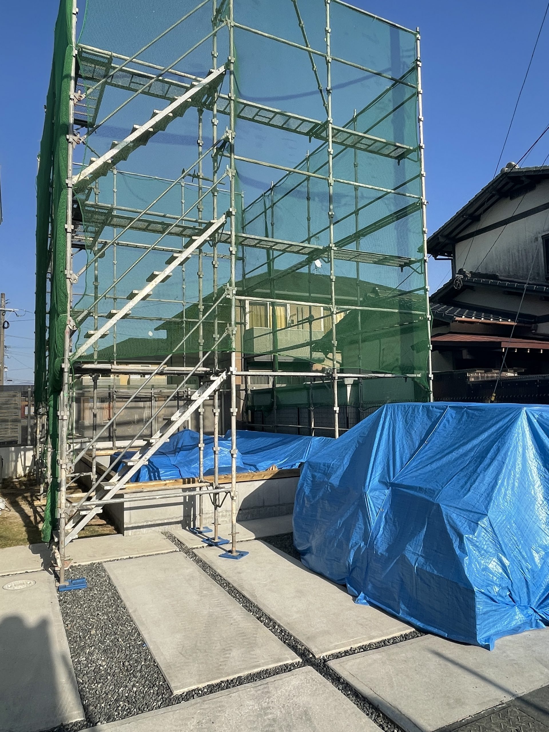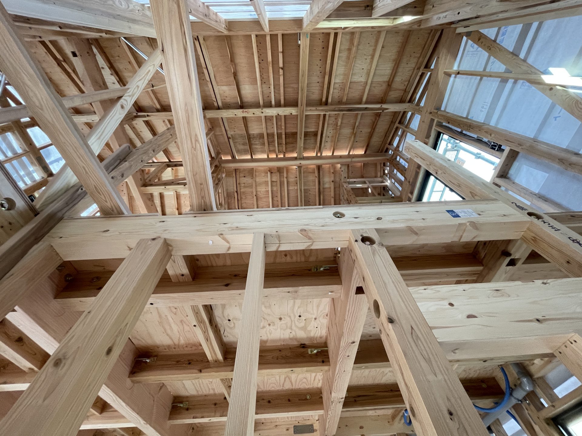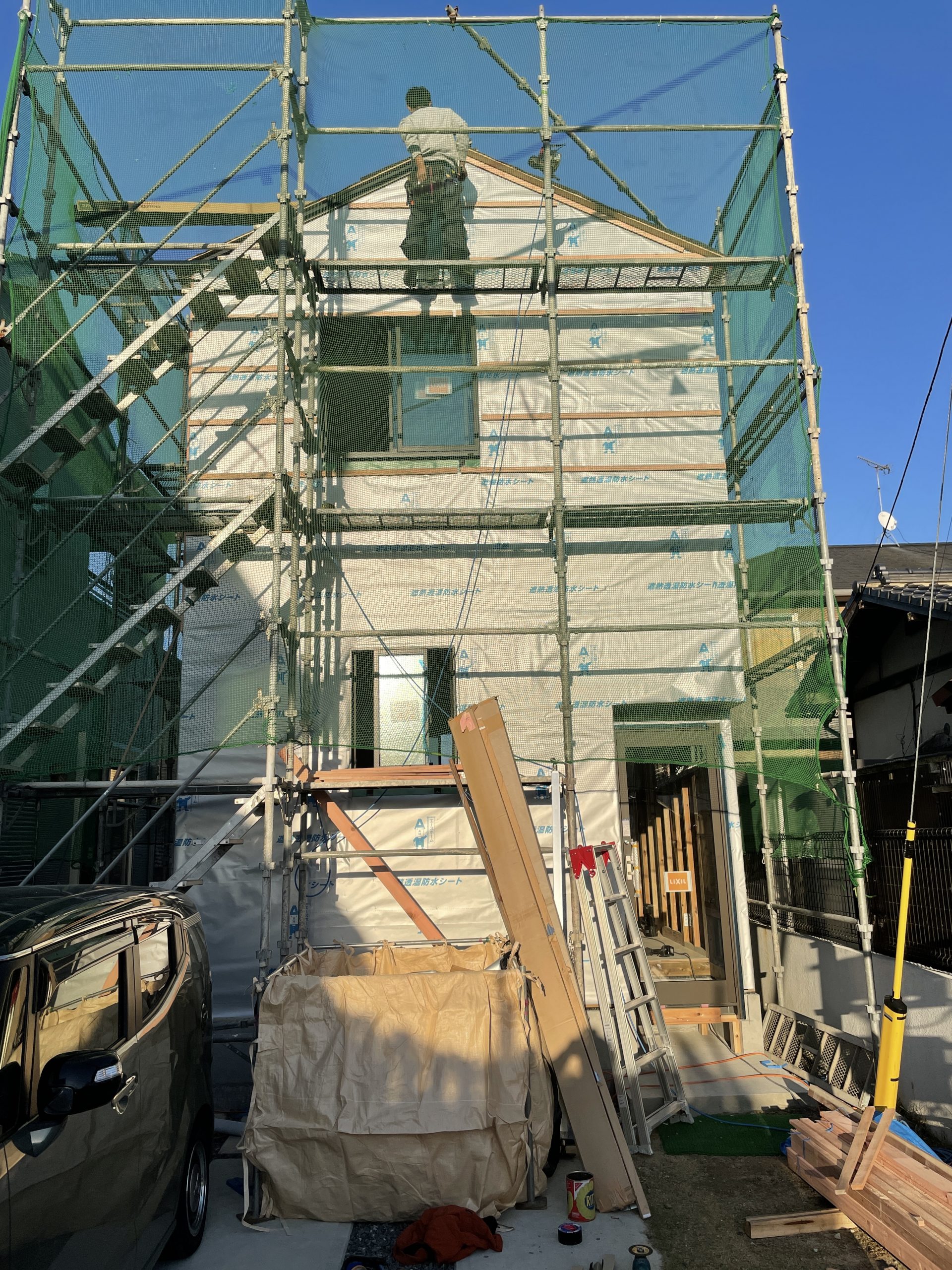 そこから基礎工事から少し期間が空いてから足場が立ち、2021年11月18日に棟上げ。あっという間に柱が立っていき形になっていきます。外壁材はまだで断念材がむき出しの状態です。