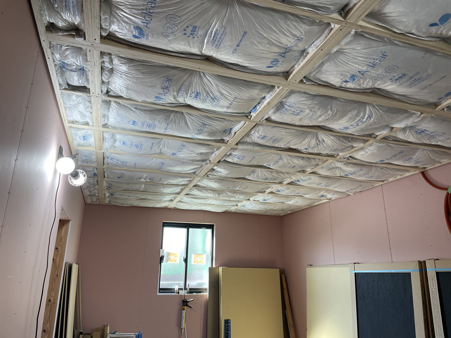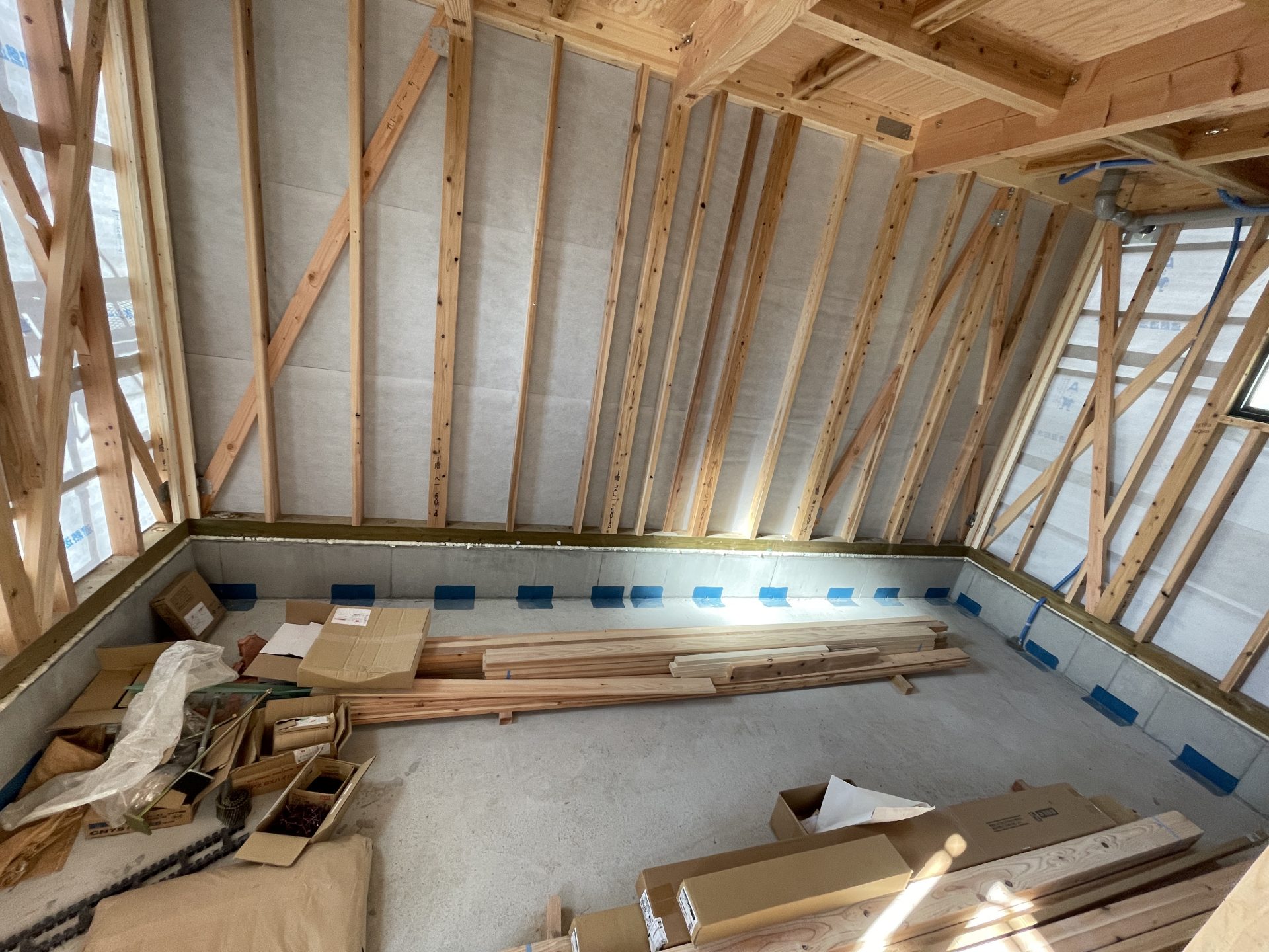 天井も高かったのがどんどん厚くなり低くなっていきます。(これはしょうがない!!)そんな中でも大工さんが頑張ってくれて2.35mくらいの高さまでとってくれました。