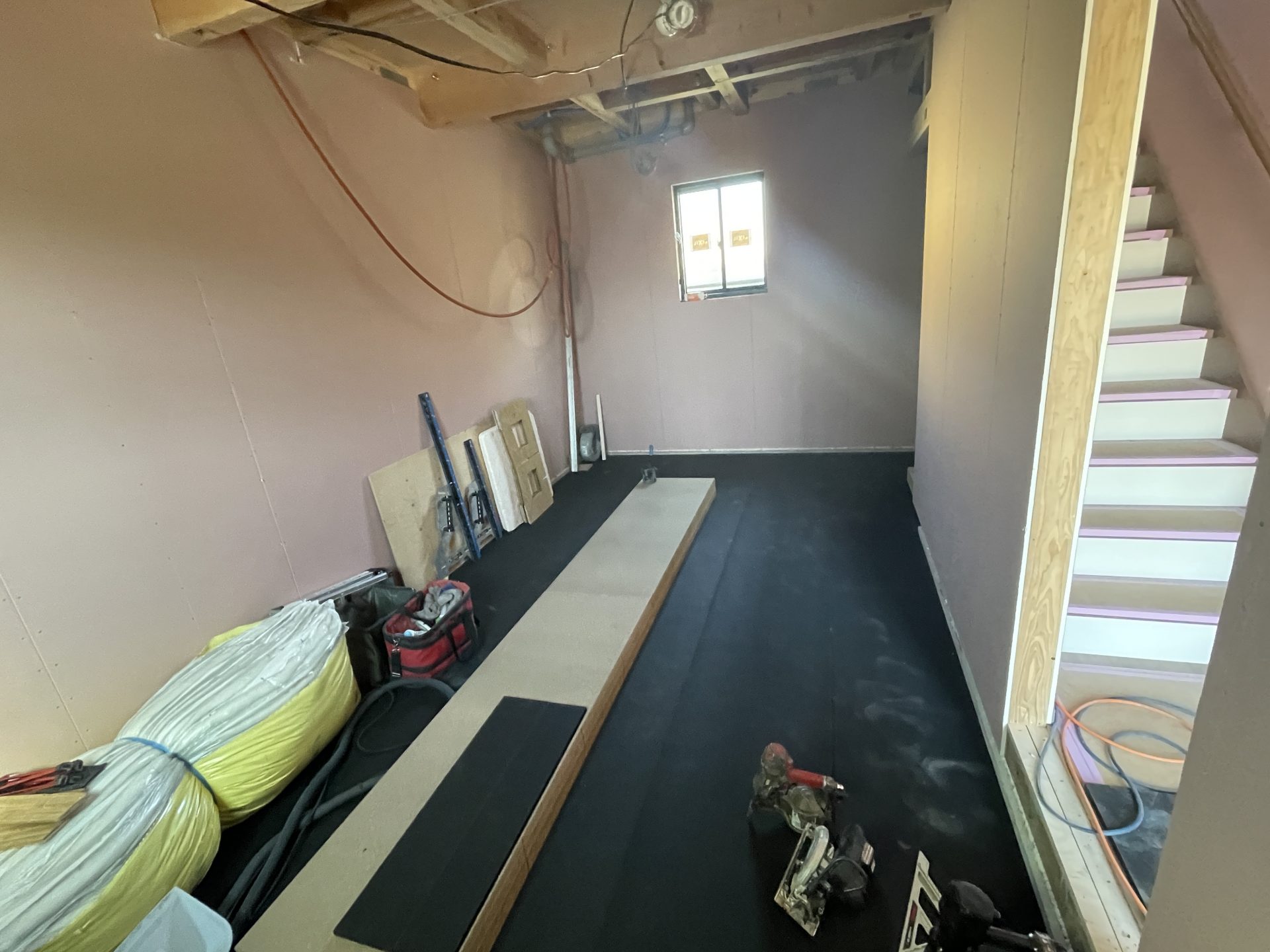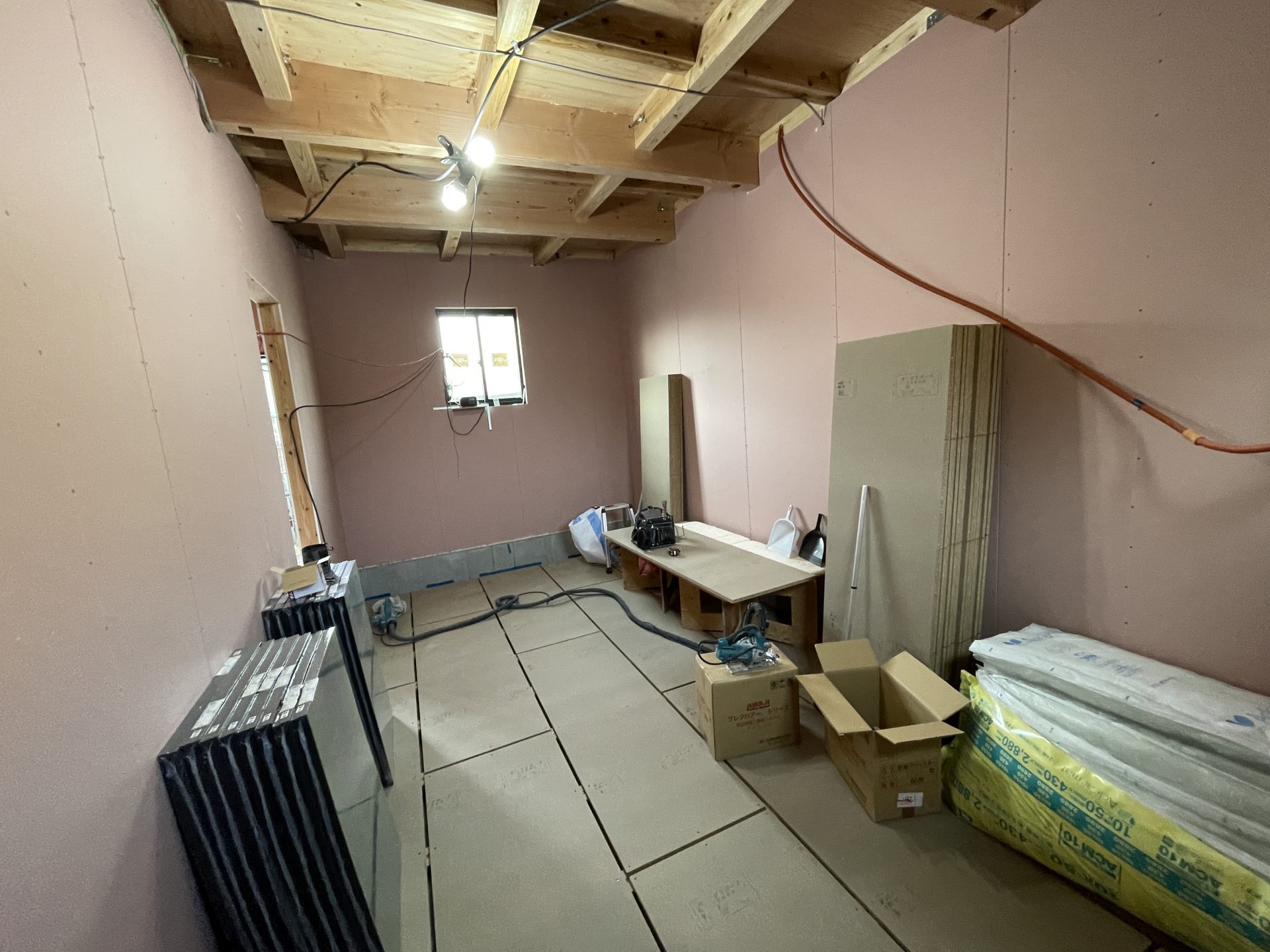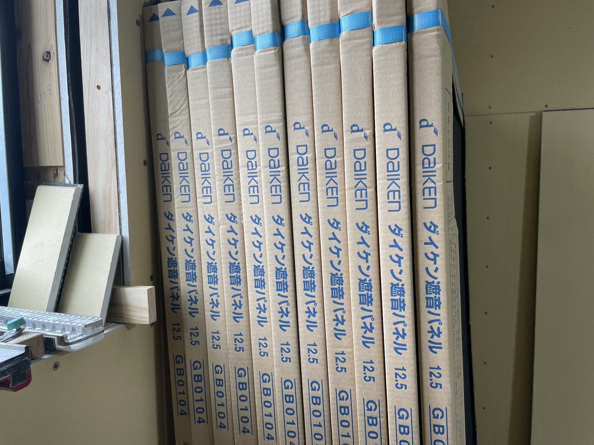 そして床面の防音施工ももう少し。振動が一番伝わる面だからでしょうか。床の遮音マット(ダイケンS18 GB08041W )は壁と比べてさらに厚いものになっています。(2022年3月12日)