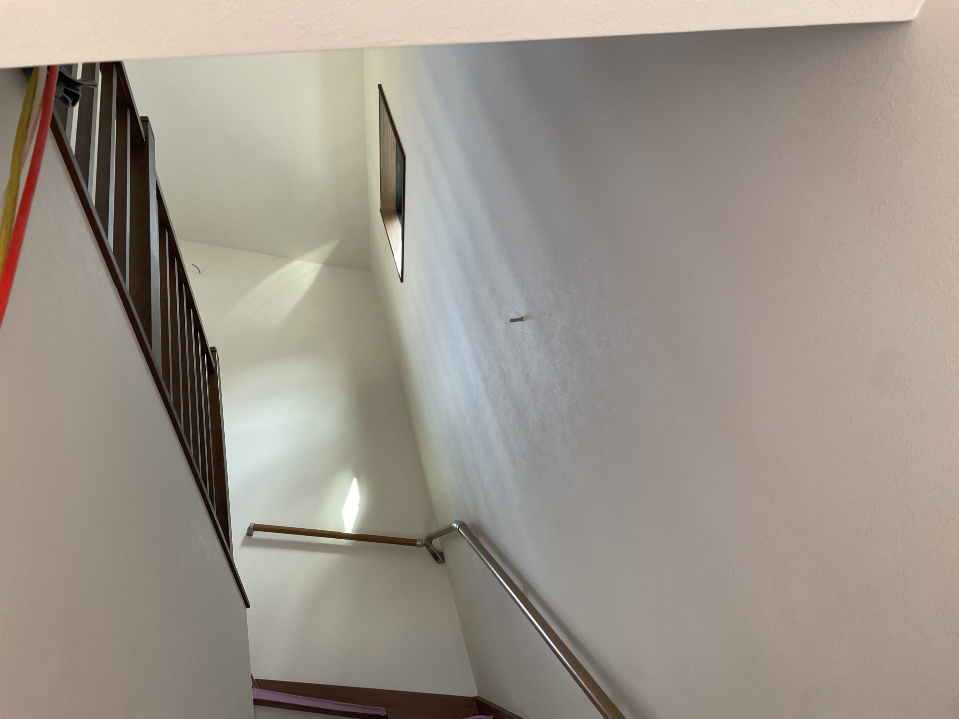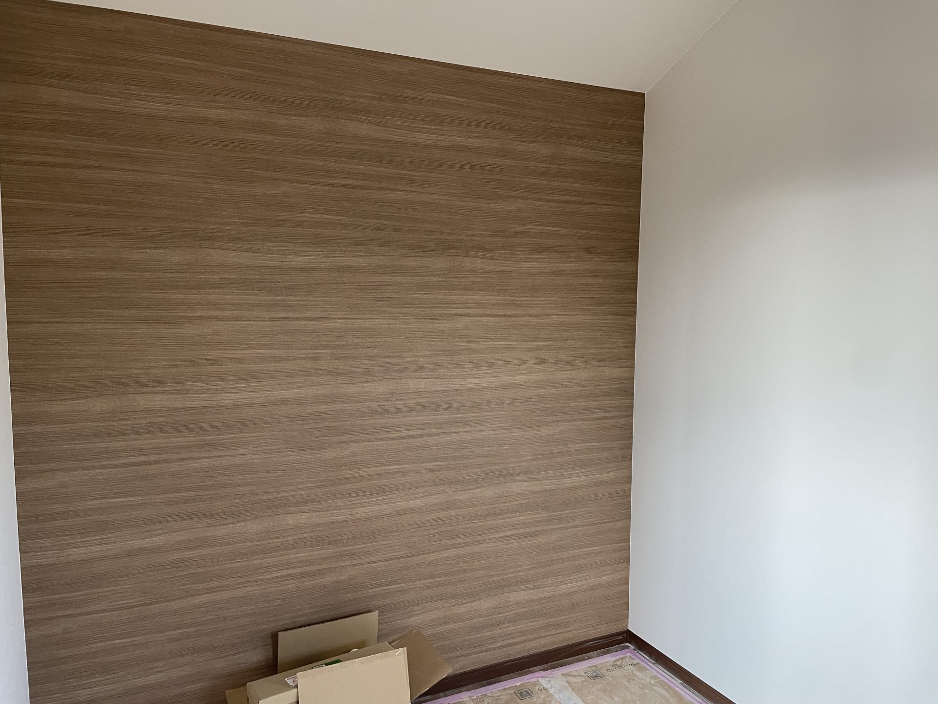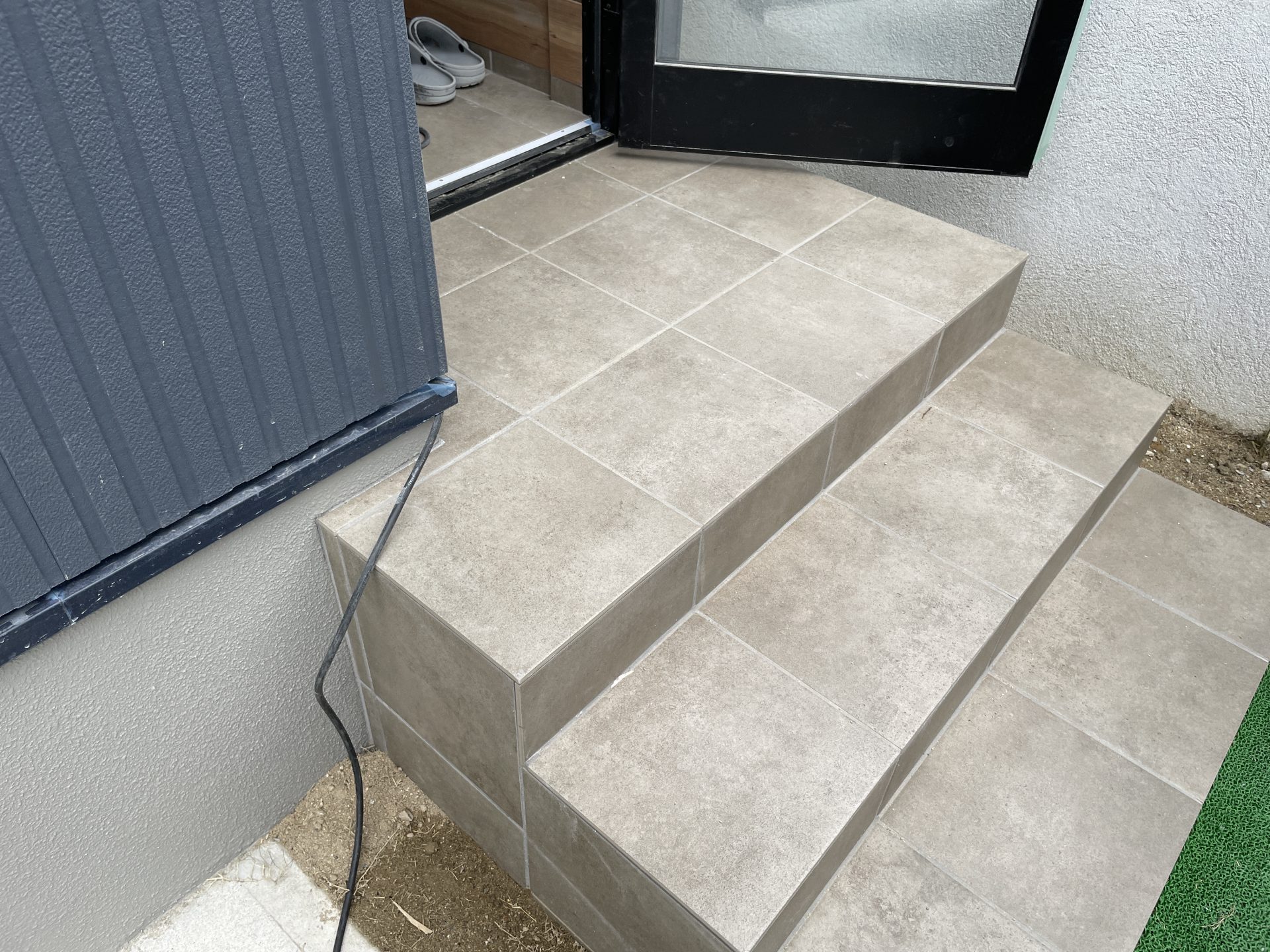 そんな中、音楽室以外の通路・待合室・トイレの壁紙が貼られました。壁紙は撥水コート、抗菌、防カビ、表面強化などデザインだけでなく機能性も考えて選びました。石膏ボードの時とはかなりイメージ変わってとてもいい感じになってよかったです。木製の手すりもいい感じです。また玄関・エントランスの床も完成。これで建物に入りやすくなりました。