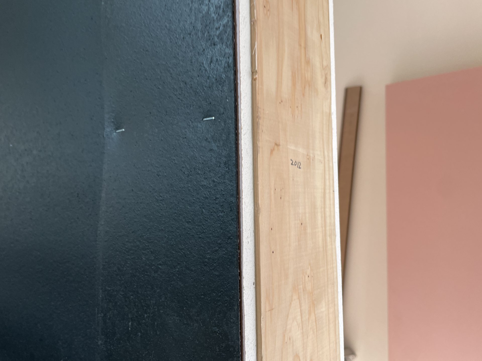 遂にミルフィーユのような3重構造の防音壁が全て完成しました。(2022年3月11日)窓枠の奥行きとスタジオ入り口の横幅で壁の厚さがわかると思います。ちなみに今は窓が1枚だけですがこれだとここから音が漏れてしまうので後日これが5重窓となります!!
