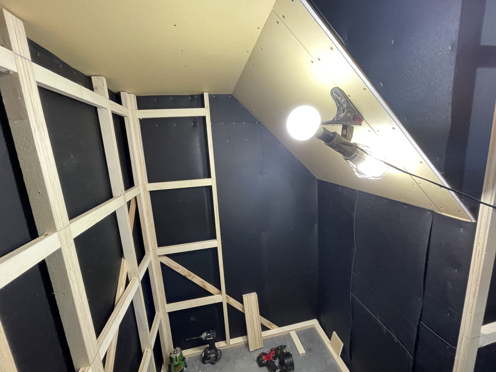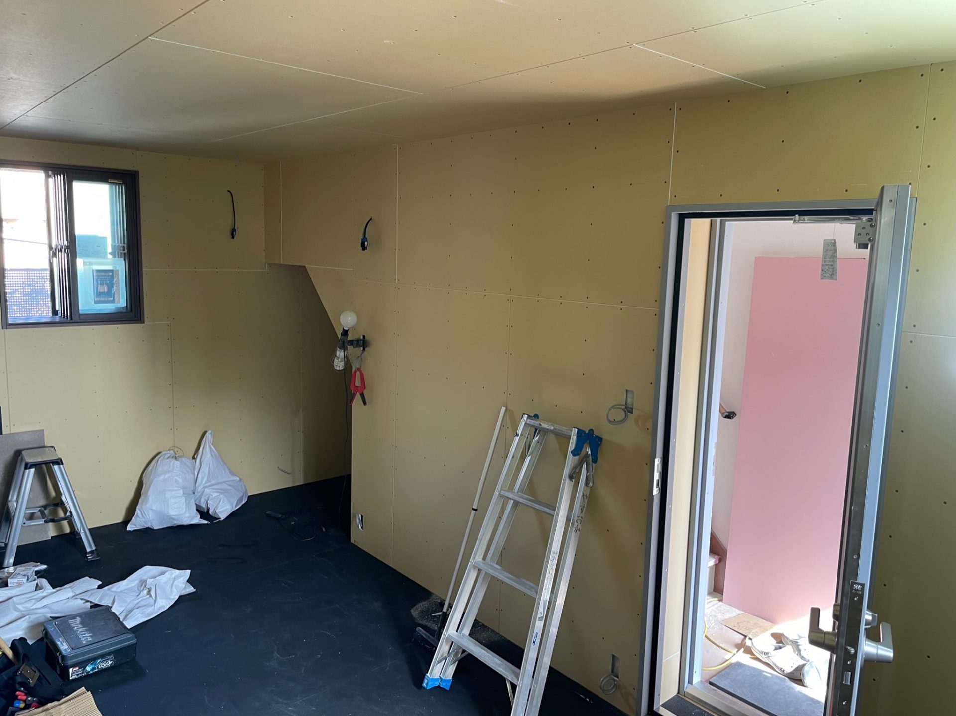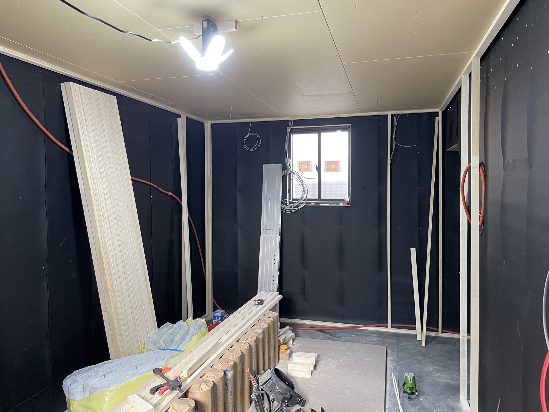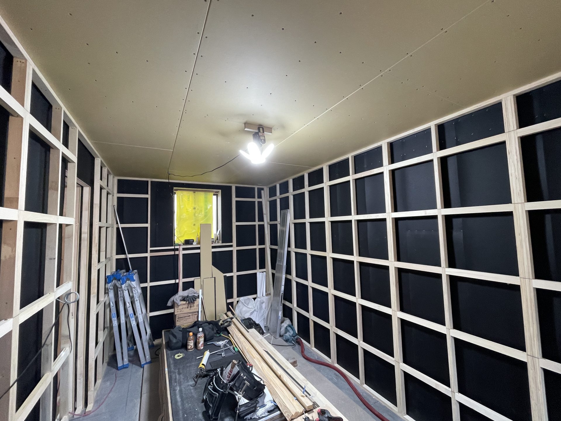 壁が遮音シートで真っ黒。この上に吸音材・遮音パネルがきます。遮音シートはDAIKENのGB0307、遮音パネルはDAIKENの12.5 GB0104を使用。音はほんのちょっとの隙間からでも漏れてしまうのでこう言った部材の効果を最大限に活かすために隙間なく施工しないといけません。そこで防音効果をより高める施工部材で大建の防音用施工部材「気密遮音コーキング333K GB0903」で隙間を完全に無くします。そして、外への音と振動をシャットアウトするためにその構造がトータル3重にも重なってきます。。。(2022年2月中旬)