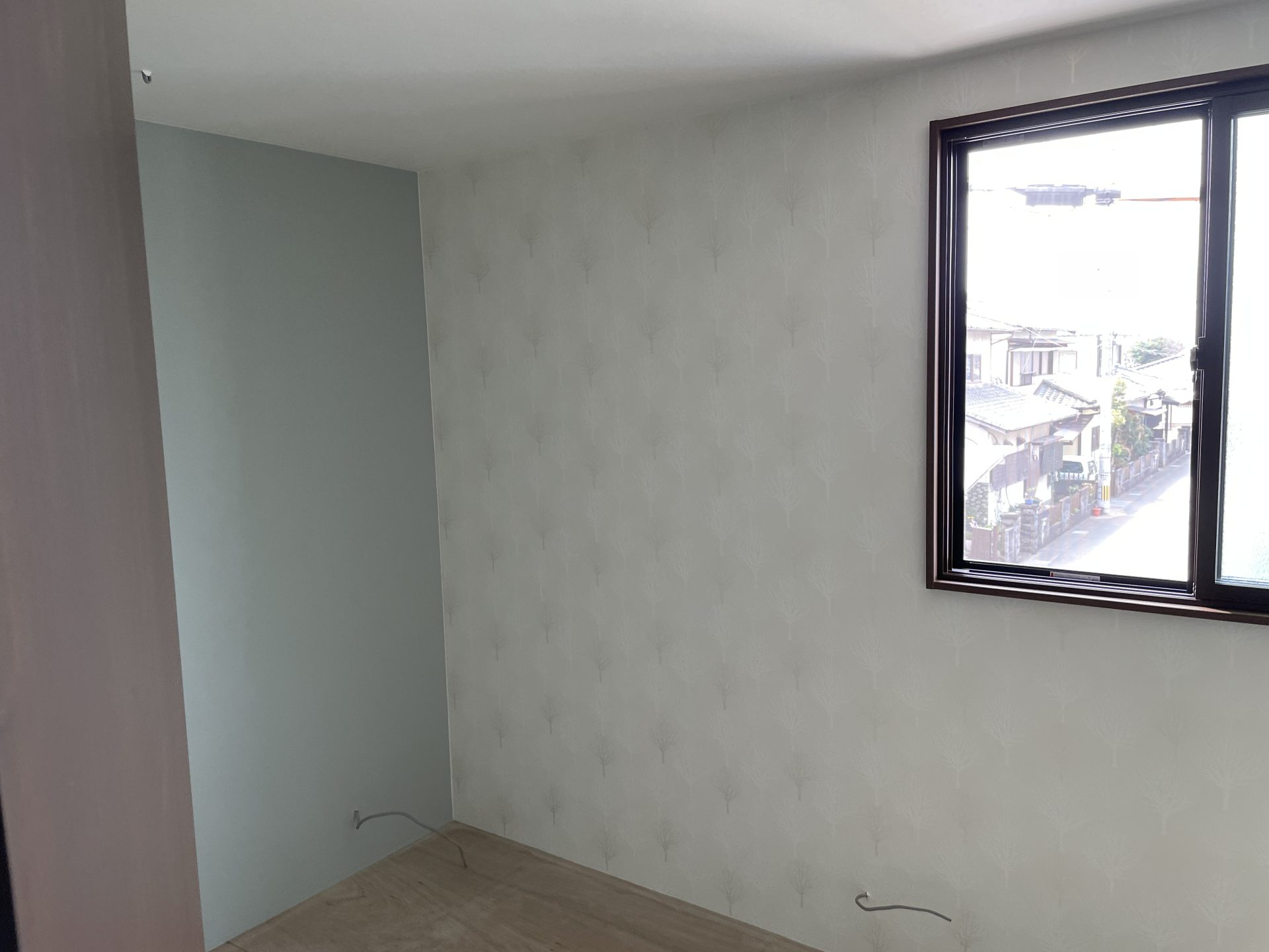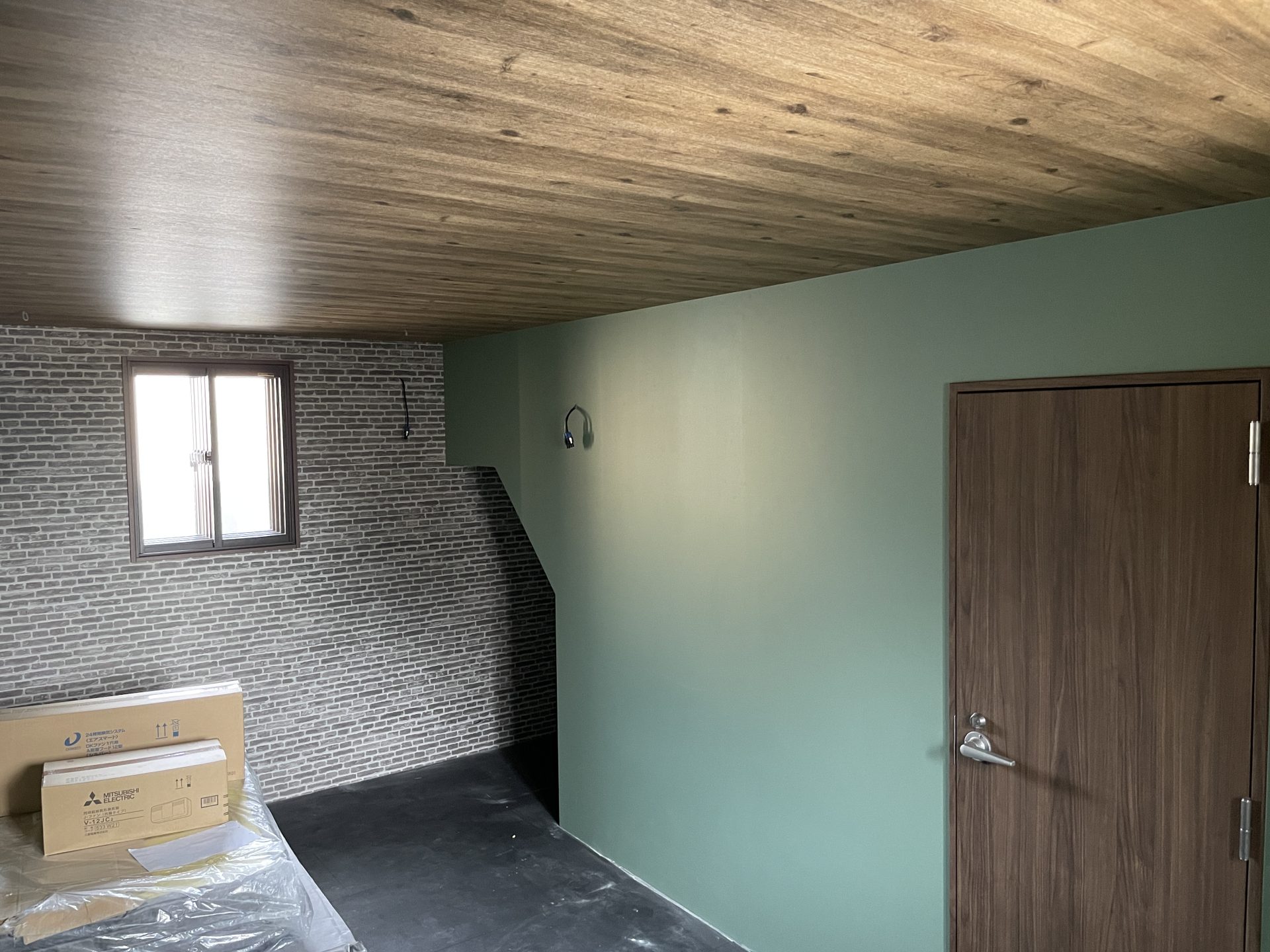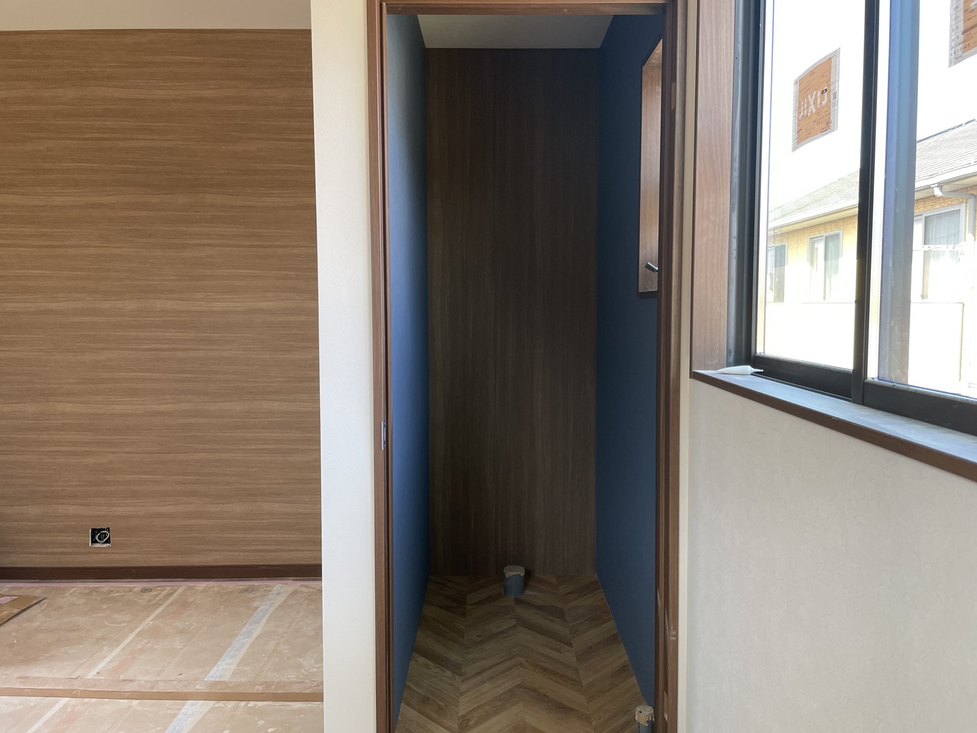 外壁・玄関ドア・窓がつき、外観が出来上がってきました。内装は石膏ボードが貼られている状態。ただし階段がないのでまだ2Fに上がれません。外壁はガルバ調の外壁材で窯業系サイディング「フィルテクト・光セラ16 ストライプ10FT」、側面1面のみ木目調の親水コート【KEMEW/FW4873U】を選びました。玄関ドアは入りやすいように室内が見えるガラスタイプを選びました。室内はできる限り外光が入る明るい感じにするために全室、窓を設置しています。また玄関横には地窓を設置。