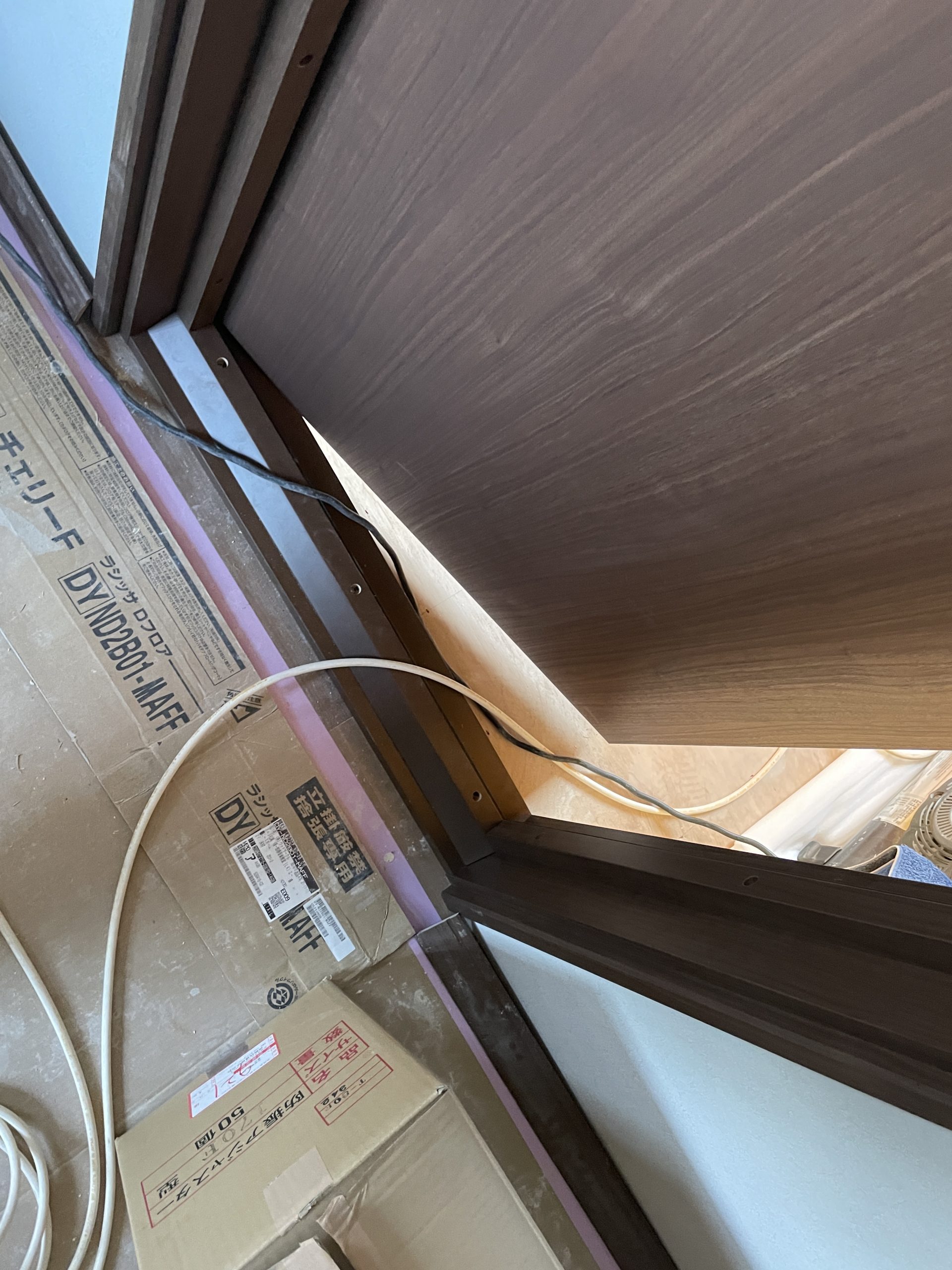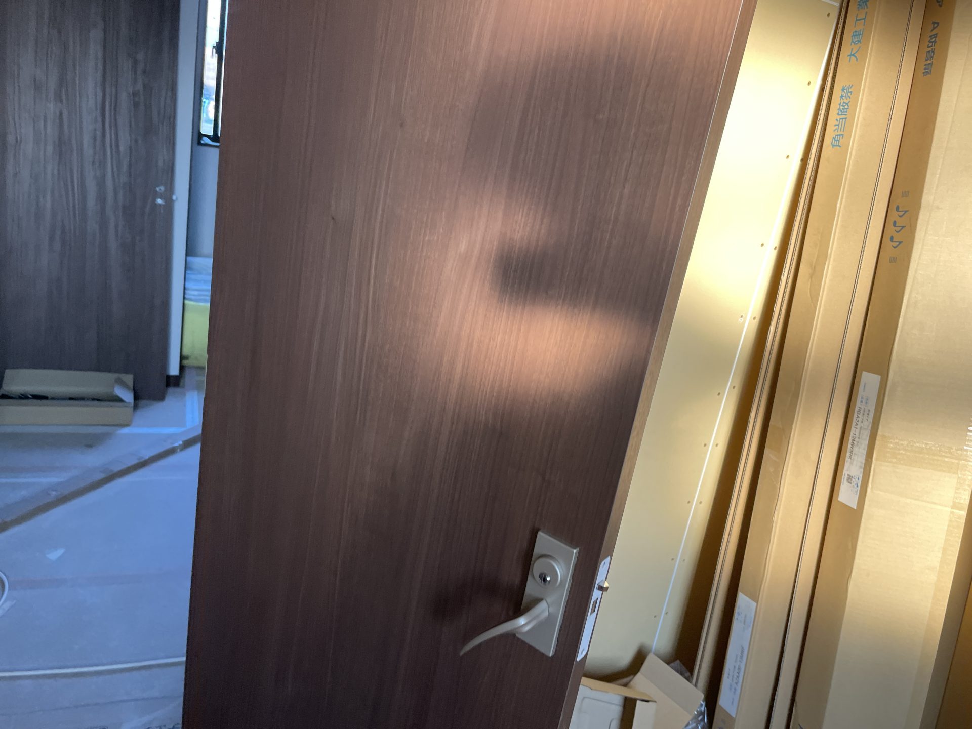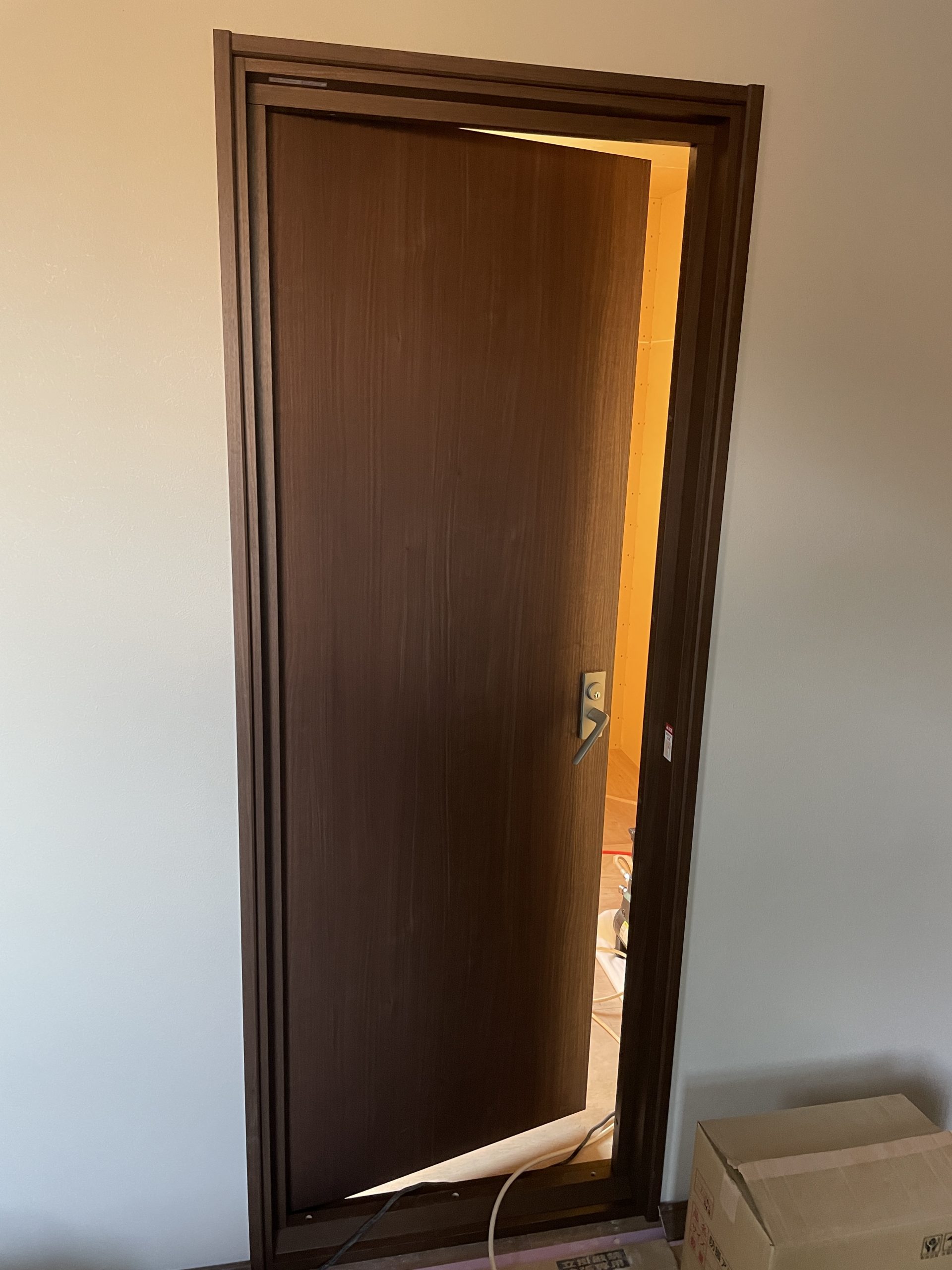 2階サブスタジオの防音扉が先に設置されました。防音ドアはDAIKEN A00 木目デザインのアドバンス(A)です。1点ロックのグレモン錠と扉内部のしっかりしたドア枠の高剛性フレームにより、高い気密性を確保しています。また大型のパッキンも採用している防音ドアです。通常の住宅用のドアよりも重さを感じました。