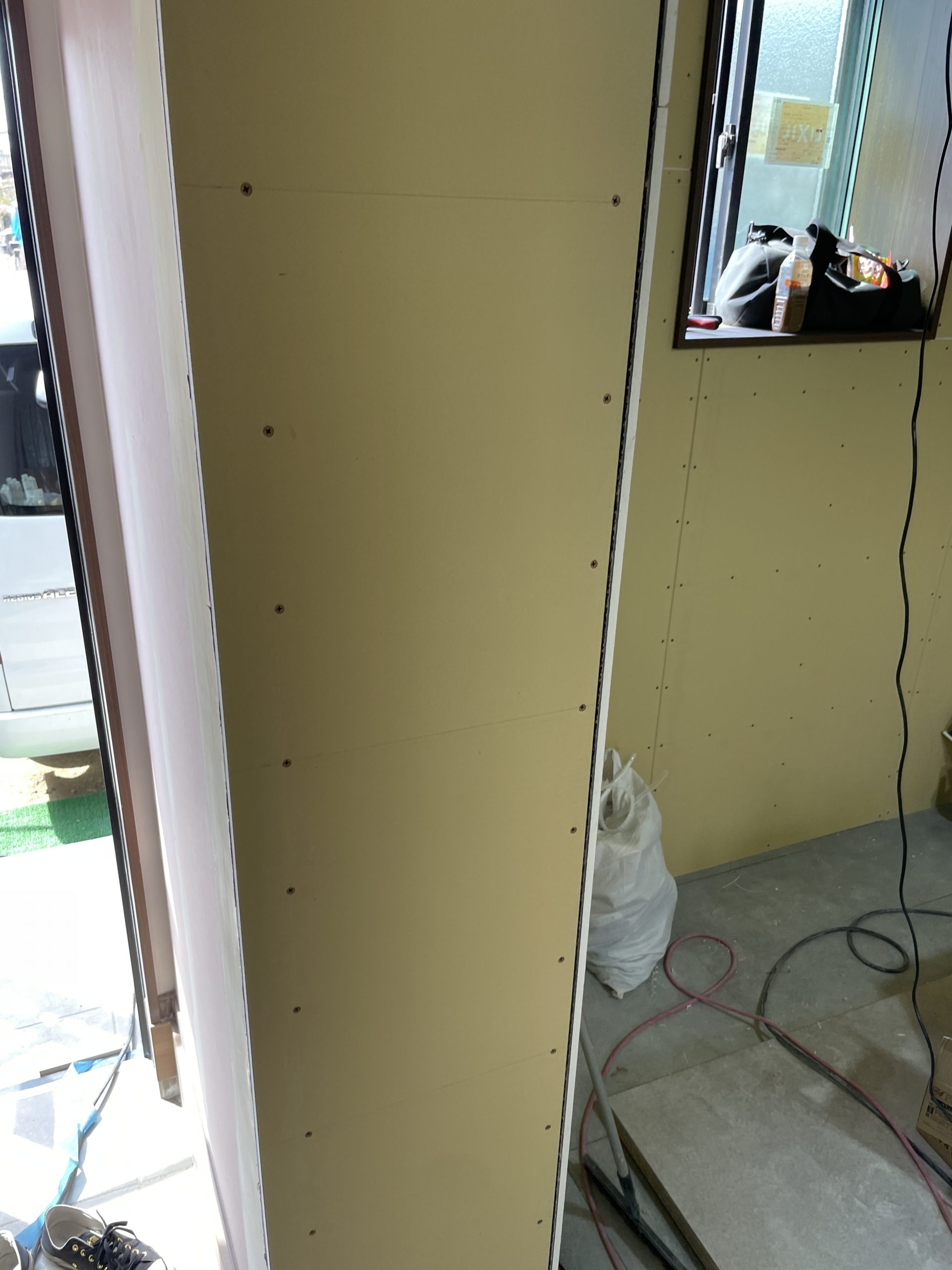 3重構造の分厚い壁・・・音をシャットアウトするためには壁を分厚くする・・・考え方的にはとてもシンプルです。。。スタジオ内に収納スペースも確保。ここに扉は設置しないのでこのスペースももちろん防音施工を施してあります。(2022年3月3日)