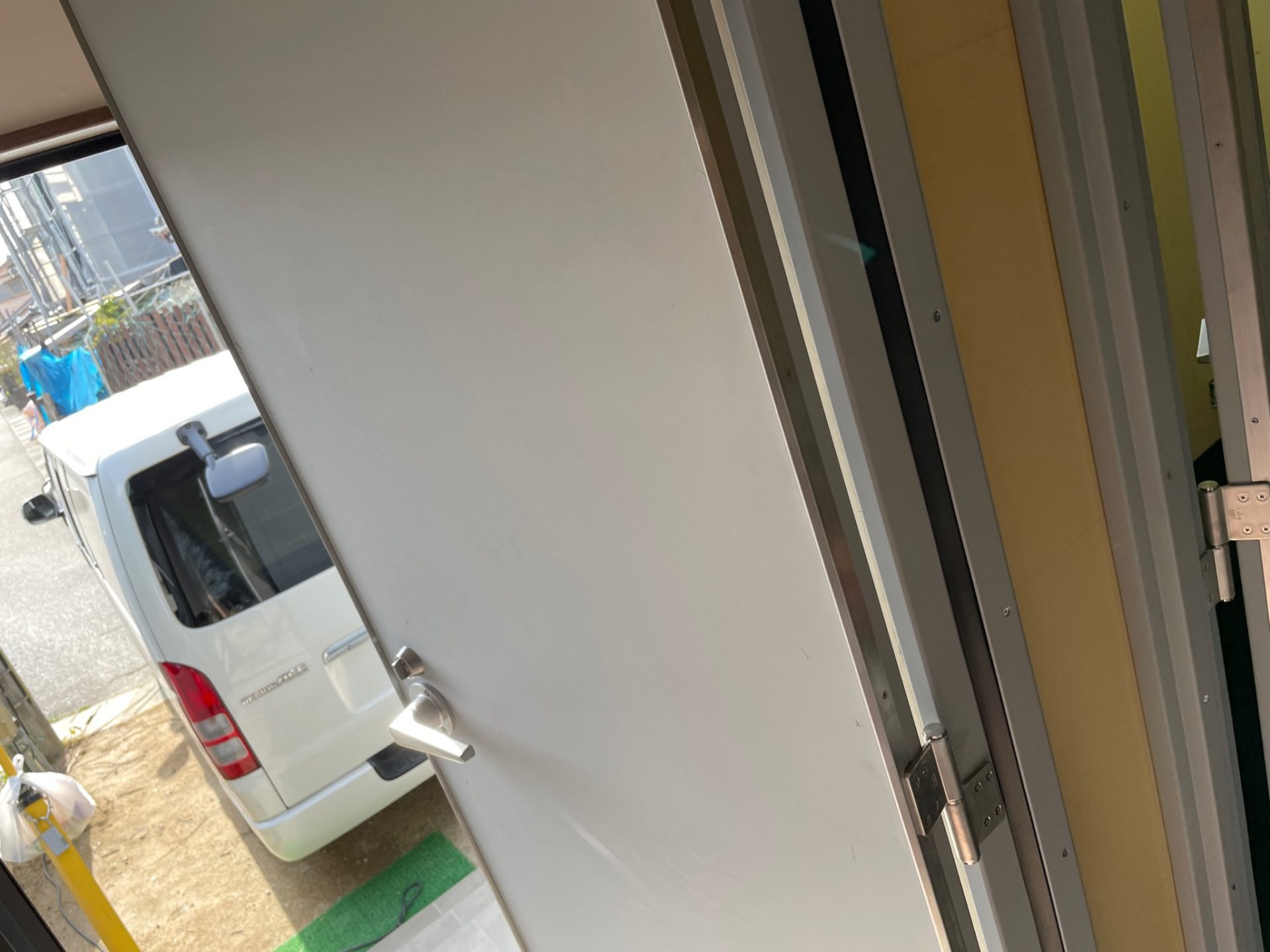 1Fメインスタジオの2重の金属製の防音扉が設置されました。これにクロスが貼られます。写真では分かりづらいですがメインスタジオは9帖以上の広さがあります。