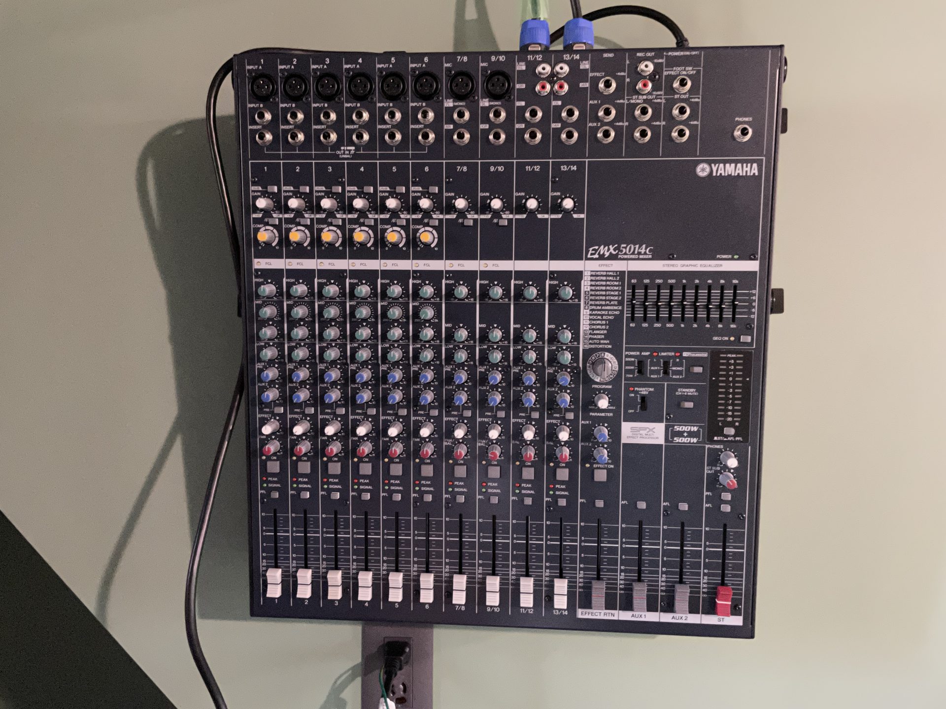 少しでも広さを取るためにモニタースピーカーも天井から吊るします。そのためにスピーカーを吊るす天井部は補強を入れてもらいました。選んだモニタースピーカーはPAスピーカー定番のElectro-Voice(エレクトロボイス)/SX300E(1台約14.5キロほど)。パワードミキサーは安定のYAMAHA/EMX5014Cを導入。これも場所を確保するために壁に掛けてもらいました!天井・壁掛けにすることでトータル1.5帖分ほどスペースを広くとれることになります。