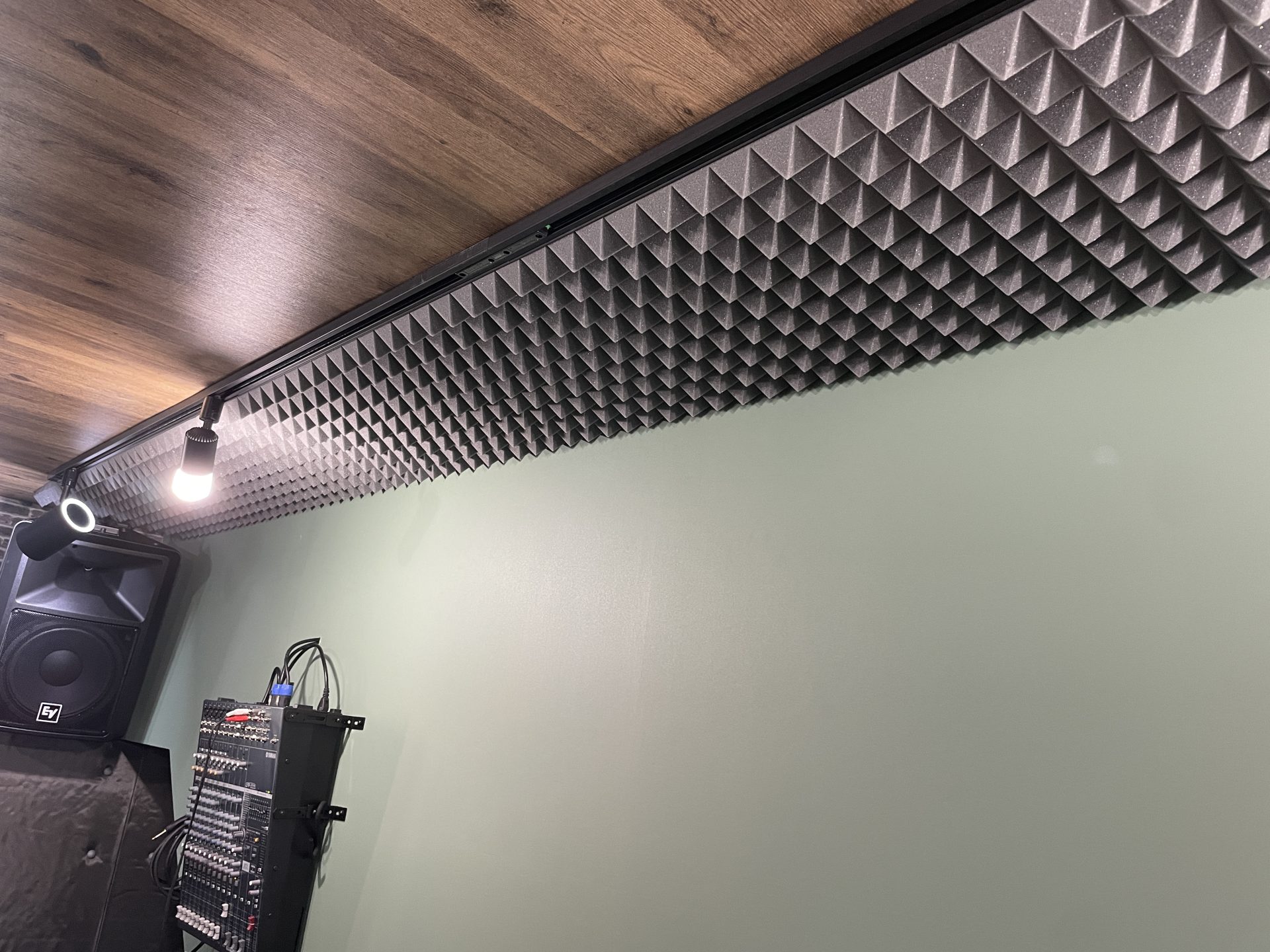 そして、このままだと音が反響しまくってまともに演奏ができませんので吸音材を取り付けていきます。ただ、むやみやたらに貼りまくるとせっかくのクロスが隠れてしまうので見た目と吸音効果のバランスをとりながらドラム背面に大きな吸音マットで埋めて天井にはピラミッド型の吸音材SONEX (ソネックス) PYR2をダクトレールのラインに合わせてとポイントで貼っていきました。