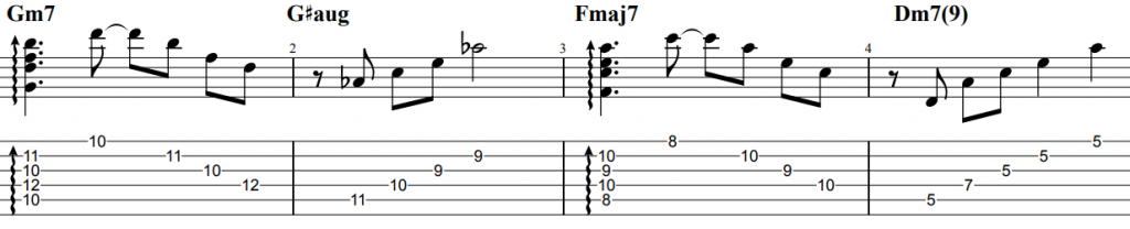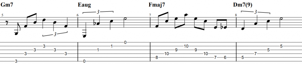 指弾きでのアルペジオフレーズとなっています。サウンドはジャズテイストなクリーンサウンドにしてあげましょう。曲のkeyがFに対してのコード進行となっておりtwo-five-oneの進行や7thコードの対しての代理コード(オーギュメント)、テンション音、コードフォーム、経過音を含むベースラインなどおしゃれな雰囲気のフレージングとなっています。そのあたりを意識して練習すると良いでしょう。