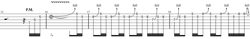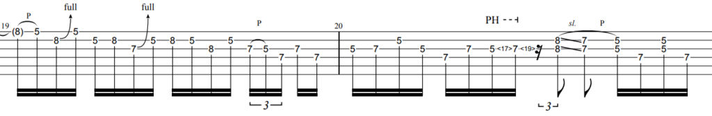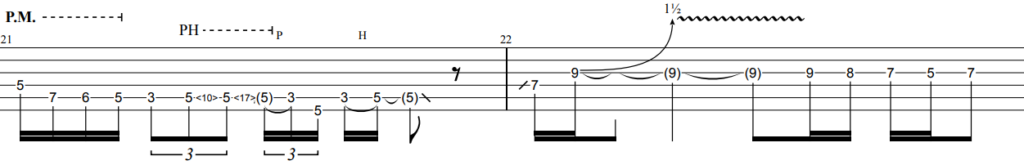 松本孝弘さんのギターソロではよくあることですがフレーズを完全に固めずに勢いを重視したアドリブ性を含むフレージングとなっています。なのでご本人はライブでは違うフレーズを弾いています。その勢いのあるフレーズを採譜して演奏したらこのような感じになりました。最初の入りですが4拍目16部音符休符後に弾き出しチョーキングで小節の頭にくるようにしっかり意識して弾きましょう。そのあとはTAK松本さんのギターソロではよく出てくるランフレーズです。またこのような早いランフレーズだとチョーキングが上がりきれずに弾きがちですがそこもスピーディーな運指でチョーキングを行いましょう。中盤の下降していくあたりのフレーズですが正直かなり聴き取りずらいフレーズとなっています。自分なりに採譜してみたらこうなった・・・という感じですので、このあたりはかなりアドリブ性が強いのでそこを再現するのであればピッキングハーモニクスやブリッジミュート・ピッキングの強弱などでニュアンスを出していきましょう。スケールとしては基本的にAマイナーペンタトニックスケールを使用しています。